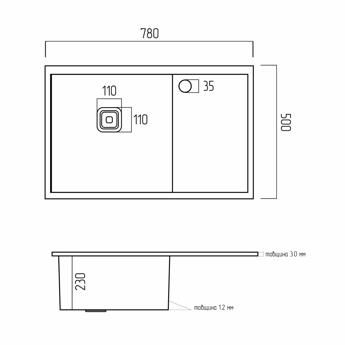 Кухонна мийка Platinum Handmade нержавійка 78*50 L (один отвір, квадратний сифон, 3,0/1,0 мм)