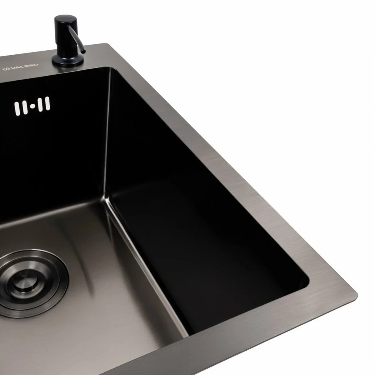 Мийка для кухні чорна VALESO виготовлена з нержавіючої сталі SUS 201 з PVD покриттям товщиною 3.0/0.8, що гарантує її довговічність. Покриття PVD мийки захищає її від подряпин потемніння та нальоту. Така кухонна мийка не боїться високих температур та впливу засобів побутової хімії.