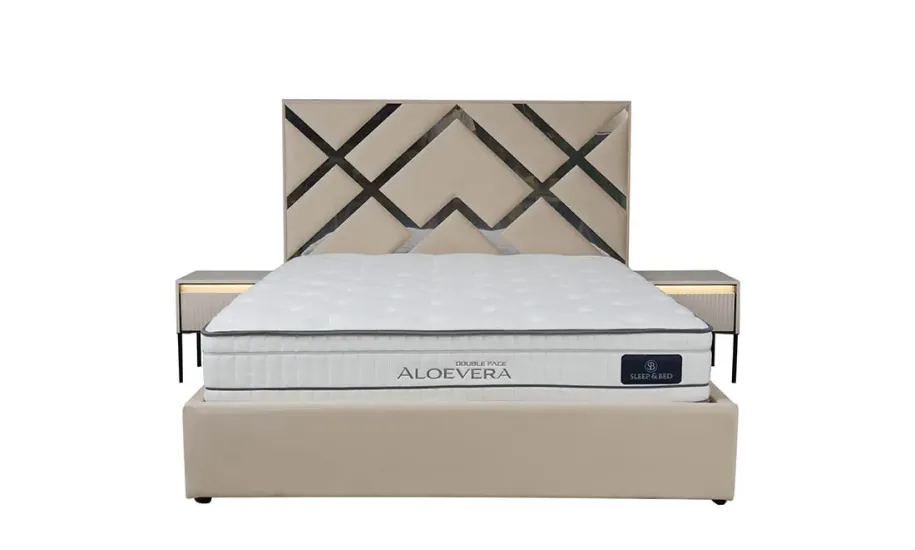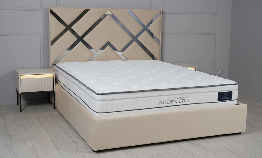 - Узголів’я висотою 1400 мм оздоблене м’яким велюром у теплій бежевій гамі, наповнене поролоном для додаткового комфорту.