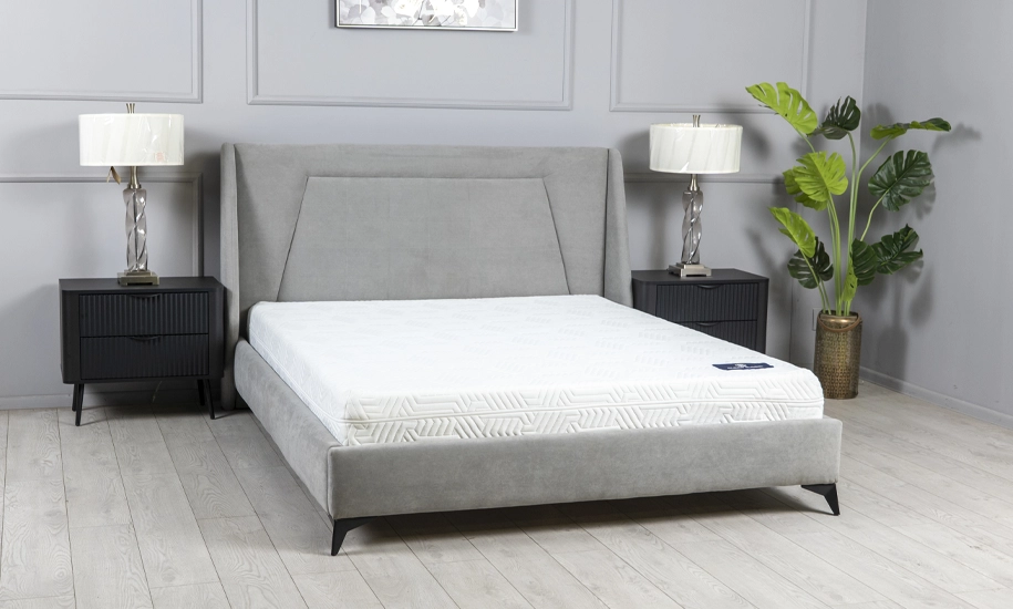- Узголів’я обтягнуте тканиною — матовим велюром кольору сірий Polo 14, яка приємна на дотик і водночас візуально додає м’якості всьому виробу. Така оббивка гарно виглядає в інтер’єрі та легко комбінується з іншими відтінками.