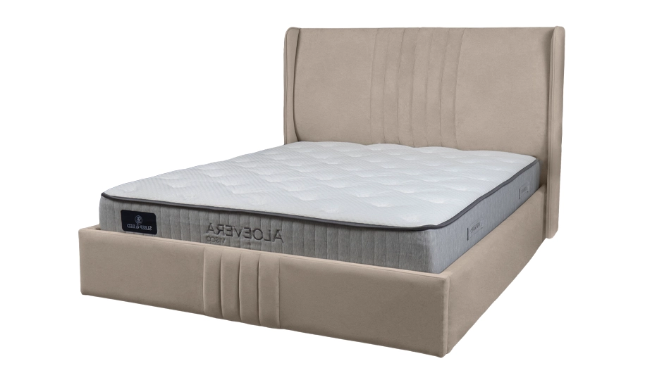 - Модель вирізняється високим узголів’ям із вертикальною прострочкою, приємною оббивкою з велюру та глибоким темно-бежевим відтінком, що пасує до стриманих інтер’єрів.