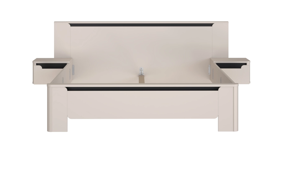 - Приліжкові тумби: виконані з тих самих матеріалів (ЛДСП/МДФ у бежевому відтінку з чорними елементами), обладнані телескопічними напрямними з механізмом Soft-Close та системою Push-to-Open для безручкового відкривання.