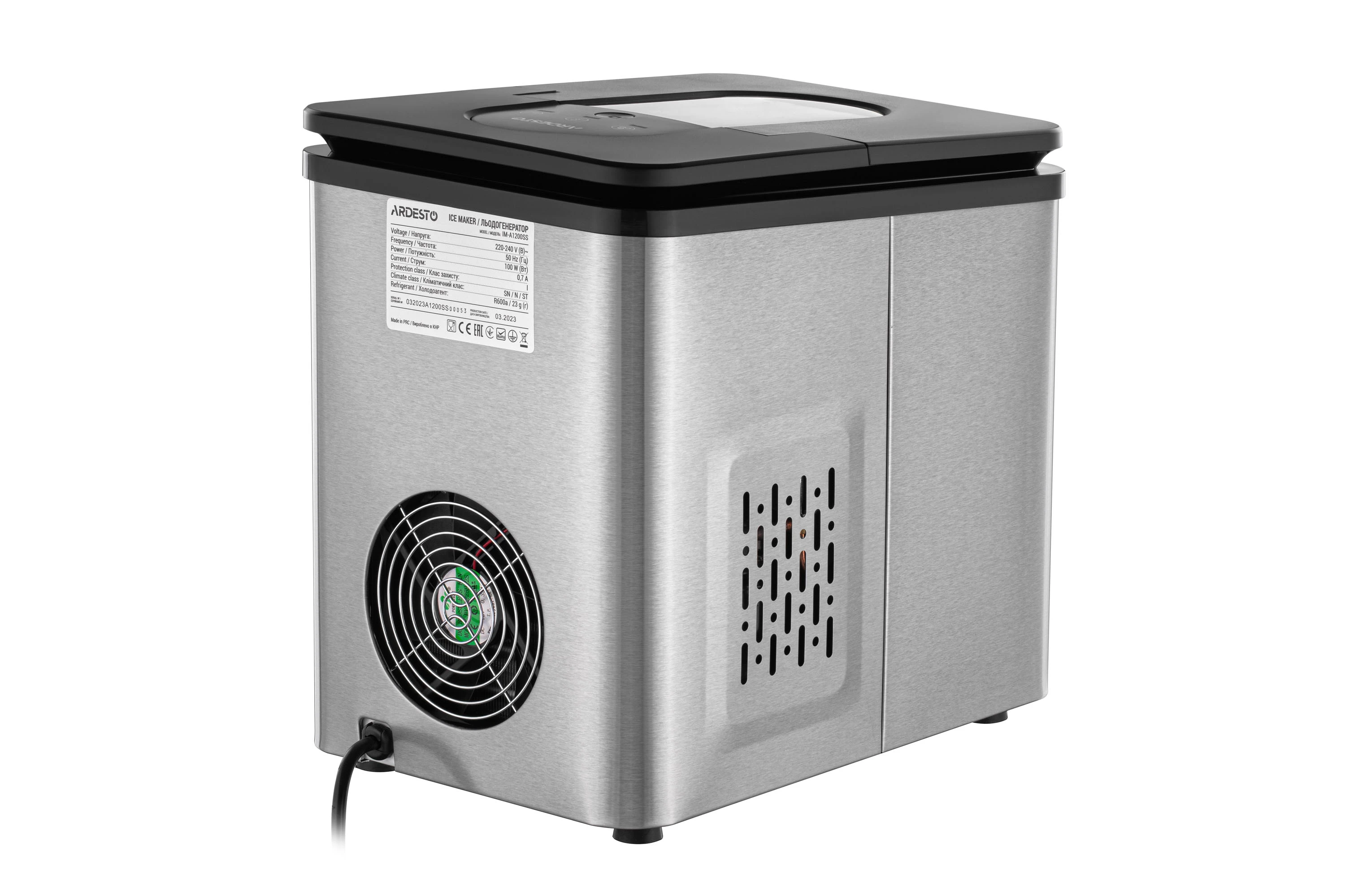 Портативний побутовий льодогенератор для швидкого приготування харчового льоду. Пристрій виконаний у стильному і практичному корпусі із нержавіючої сталі, оснащений сенсорною панеллю керування, індикаторами роботи та віконцем для візуального контролю кількості льоду. Клас захисту – І. Максимальна продуктивність ARDESTO IM-A1200SS – 12 кг льоду на добу. Контейнер для льоду – 0,6 кг, цикл приготування льоду триває близько 9 хв. Об’єм резервуара – 1,8 л.