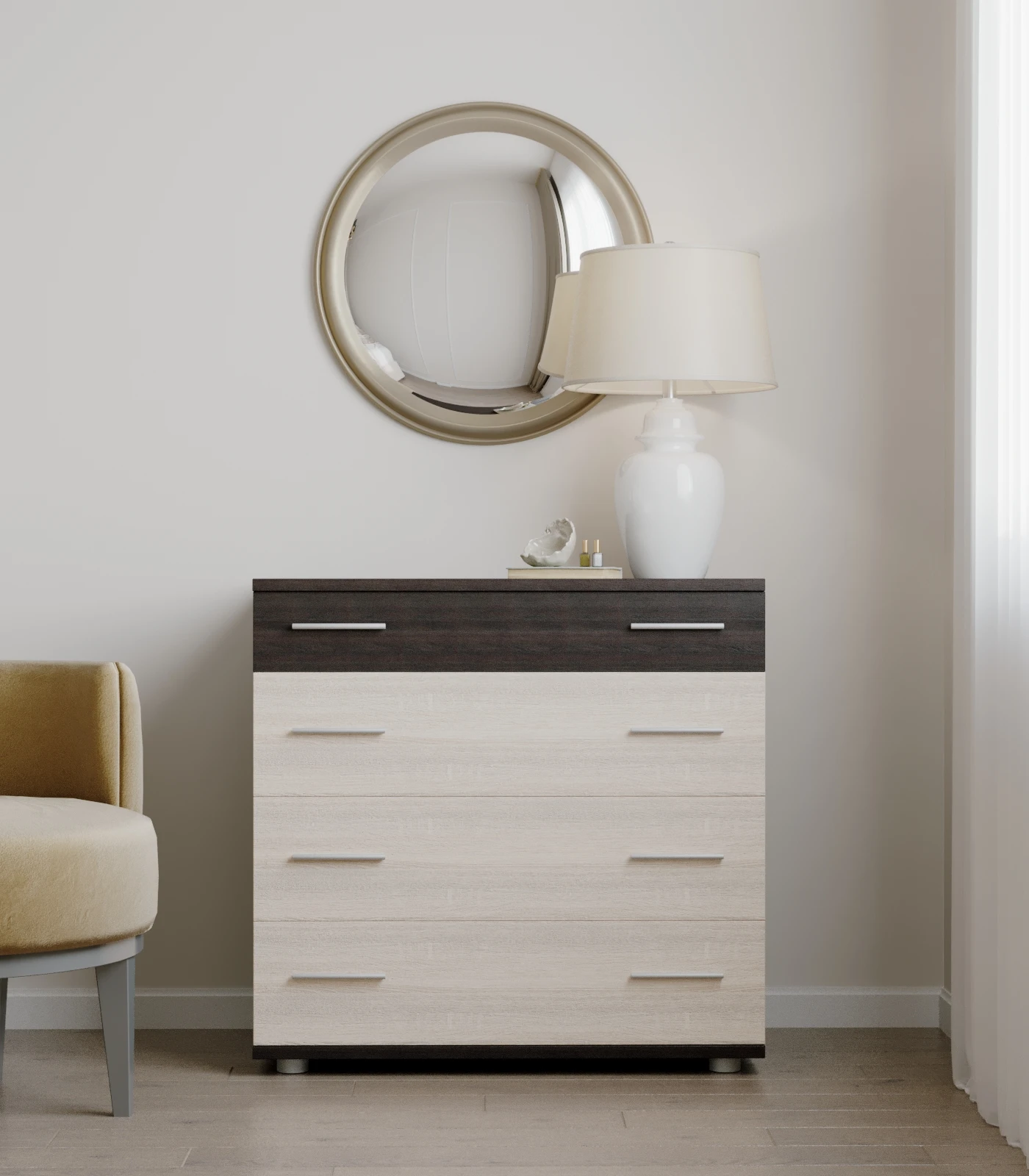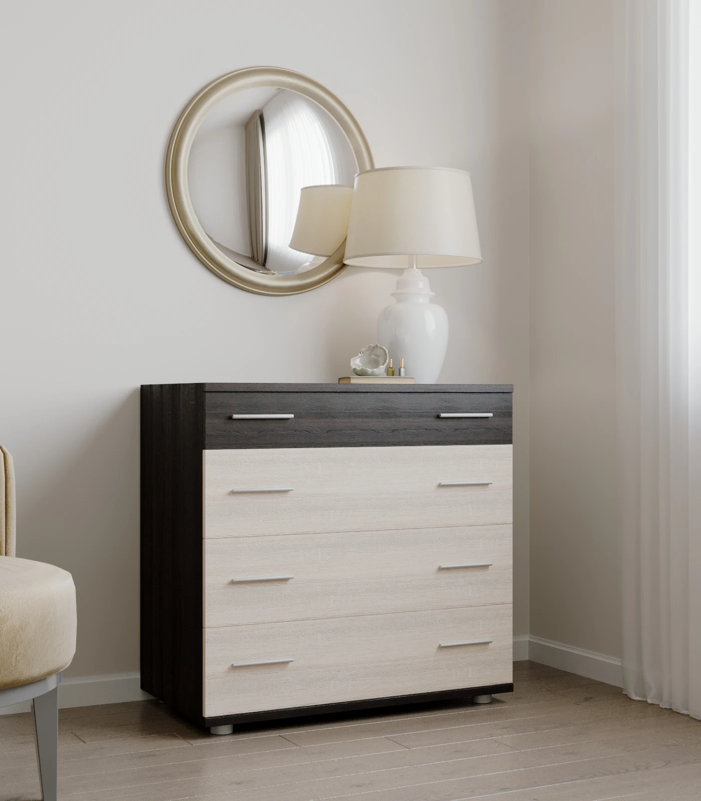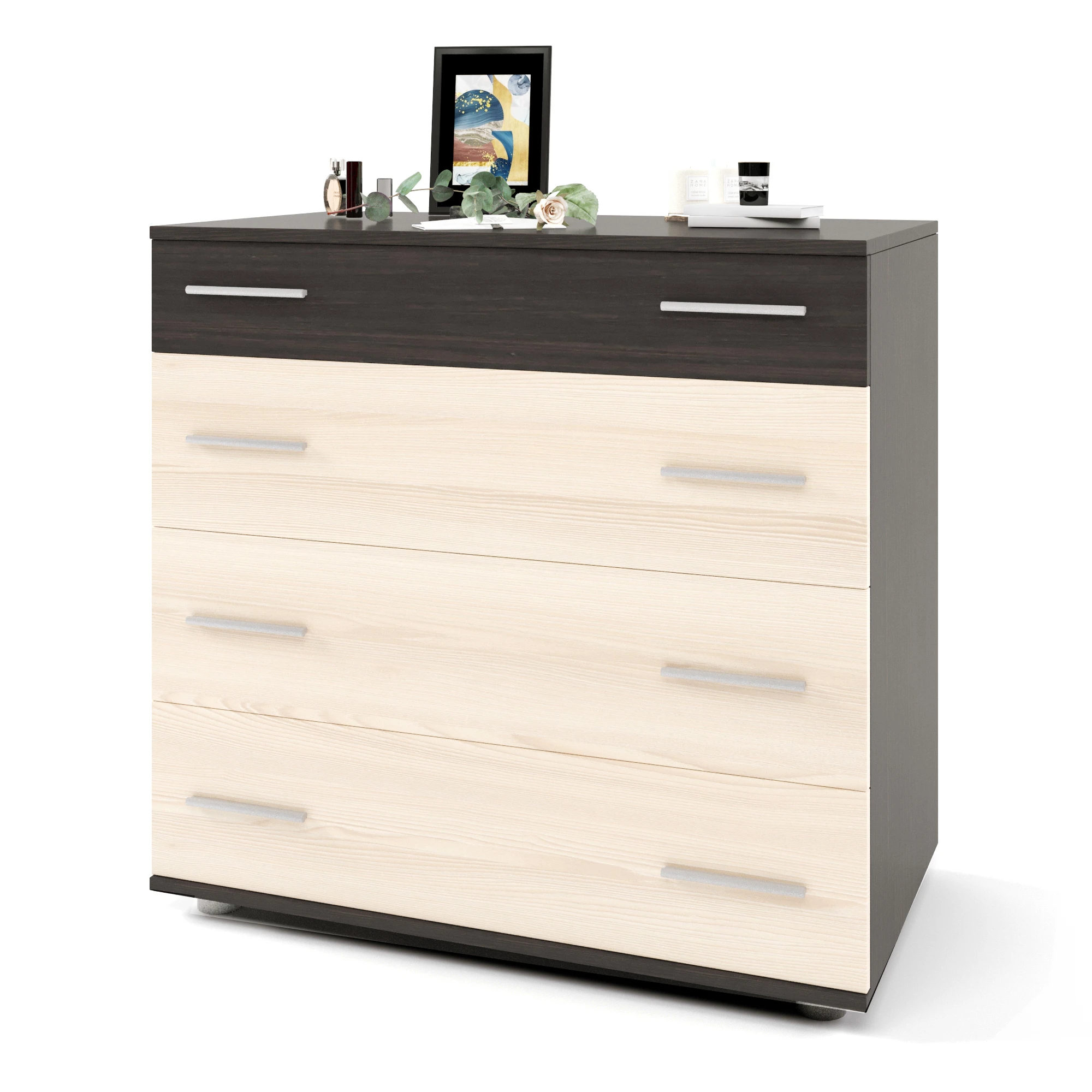 Шукаєте ідеальне рішення для організації простору? Маленький комод Еверест на 4 ящики стане чудовим доповненням до будь-якої кімнати. Завдяки елегантному поєднанню венге темного та дуба молочного, цей комод не лише практичний, але й стильний. Його компактні розміри дозволяють легко вписати його в будь-який інтер'єр, а надійні телескопічні ящики забезпечують зручний доступ до ваших речей.