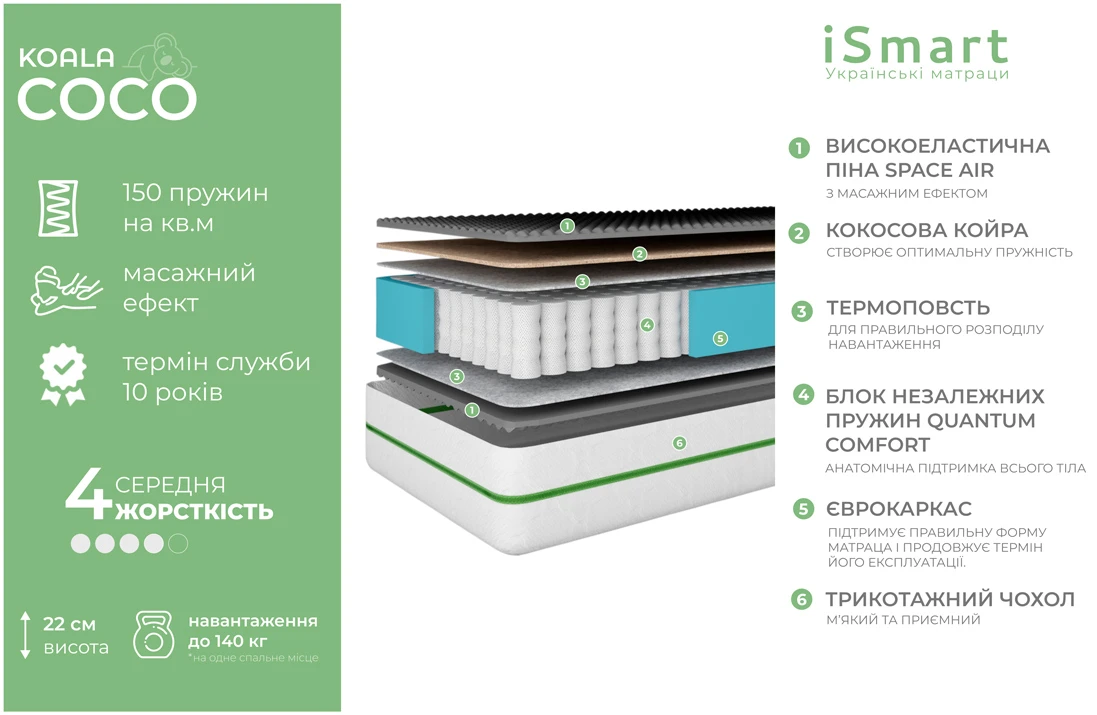 Відкрийте для себе ідеальне поєднання комфорту та підтримки з матрацом Ismart Koala Coco. Завдяки унікальному блоку незалежних пружин Quantum Comfort та натуральній кокосовій койрі, цей матрац забезпечує оптимальну жорсткість, яка підтримує ваше тіло під час сну. Високоеластична піна Space Air з масажним ефектом адаптується до контурів вашого тіла, покращуючи кровообіг і сприяючи швидкому відновленню м’язів. З жорсткістю 4 з 5, цей матрац ідеально підходить для тих, хто цінує тверду, але комфортну поверхню для відпочинку.