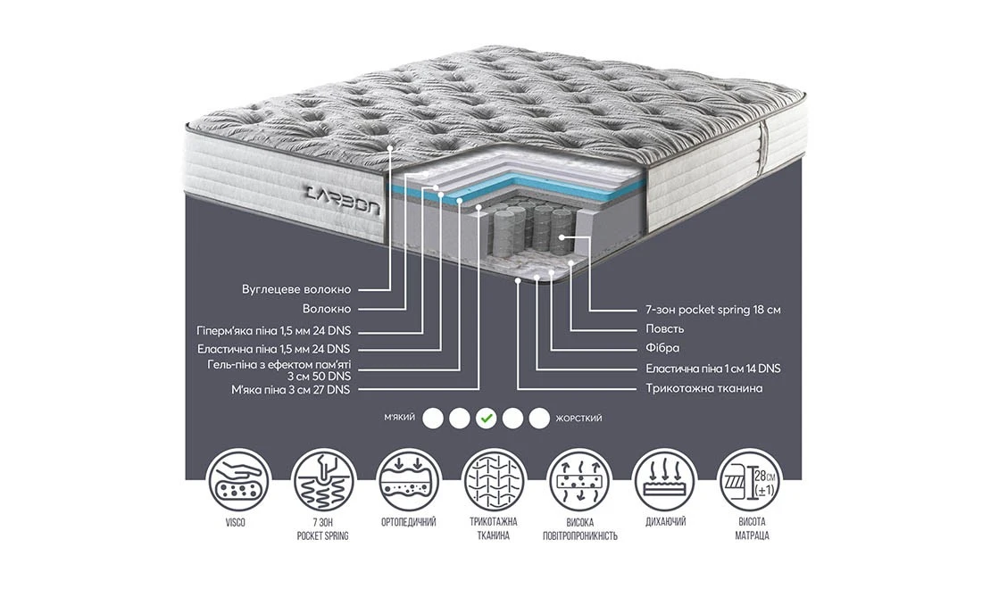 Насолодіться сном з матрасом Carbon, який використовує технологію вуглецевої пряжі, щоб повернути вам втрачену протягом дня енергію. Ми пропонуємо вам комфорт, створений за допомогою гель-піни з ефектом пам'яті, яка приймає форму вашого тіла і забезпечує йому максимально зручне положення. З матрасом Carbon ви будете щоранку прокидатися сповненими енергії та сил.