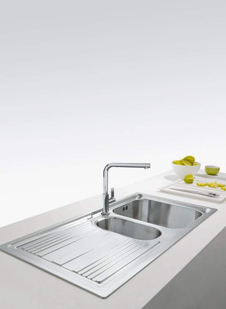 Мийка Franke Logica Line – це мийка з великою і малою чашами, а також функціональним крилом, що служить для сушіння посуду або обробки продуктів. Завдяки нахилу, вода стікає без затримок у чашу мийки. Монтаж цієї раковини franke здійснюється врізним способом – швидко і просто, навіть без спеціальних навичок. Отвір під змішувач передбачений у конструкції.