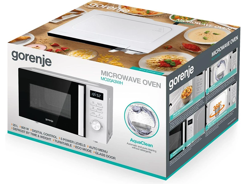 Мікрохвильова піч GORENJE MO 20 A 3 WH - потужність мікрохвиль 800 Вт. Це зручна модель для побутового застосування, за рахунок компактних габаритів піч не займе багато місця на робочій поверхні, можна встановлювати на верх холодильника. Корпус виконаний в елегантному кольорі та підійде для сучасних кухонних інтерєрів. Пекти оснащено дисплеєм з електронним керуванням - у меню вбудовано кілька автоматичних режимів. Зручно, економічно та функціонально – можна швидко розморожувати продукти, готувати чи розігрівати страви на різних рівнях потужності. Покриття внутрішньої камери легко відмивається від жиру за допомогою автоматичного очищення AquaClean.