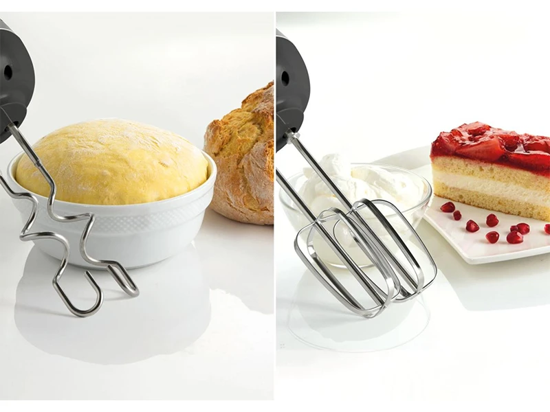 У комплекті з ручним міксером постачаються спеціально розроблені копистки та гачки для тіста з нержавіючої сталі. Ідеально підходить для приготування печива, хліба або збитих вершків.