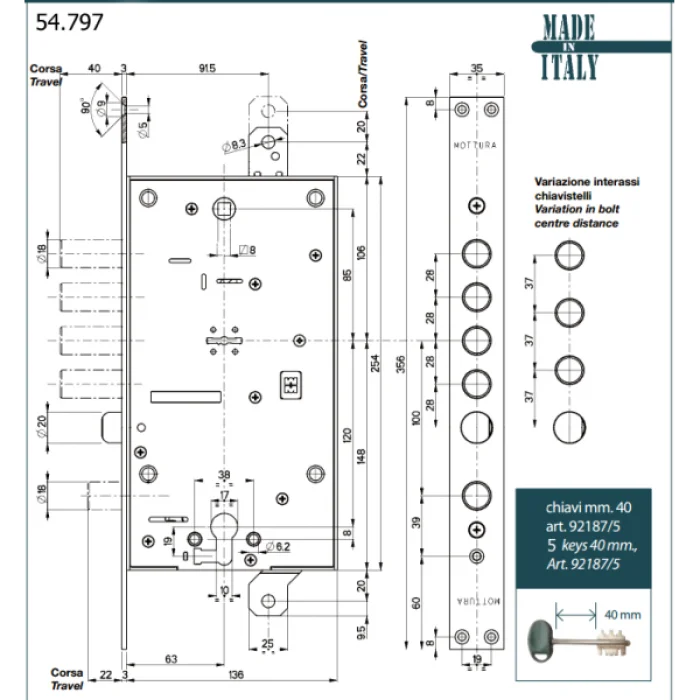 Замок MOTTURA 54797TBDR55 сумісний із броненакладками, ручками, петлями та циліндрами євростандарту. Завдяки стандартним монтажним розмірам легко встановлюється у більшість сучасних дверних полотен. Може поєднуватися з фурнітурою MOTTURA або аналогічними комплектуючими в кольорах хром, сатин, антик і нікель.