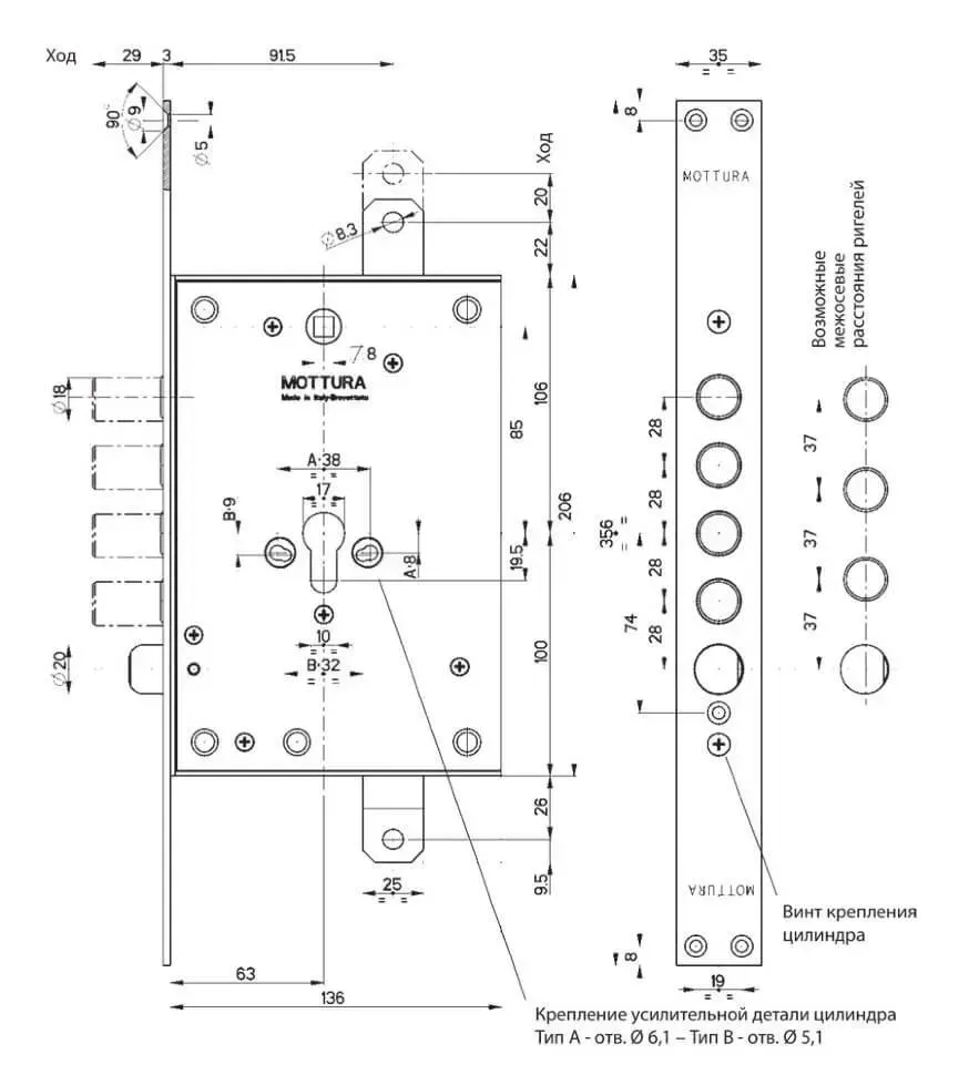 Основне про модель MOTTURA 85971S28T — 4-ригельний замок із захистом під циліндр, тягами та антибампінгом
