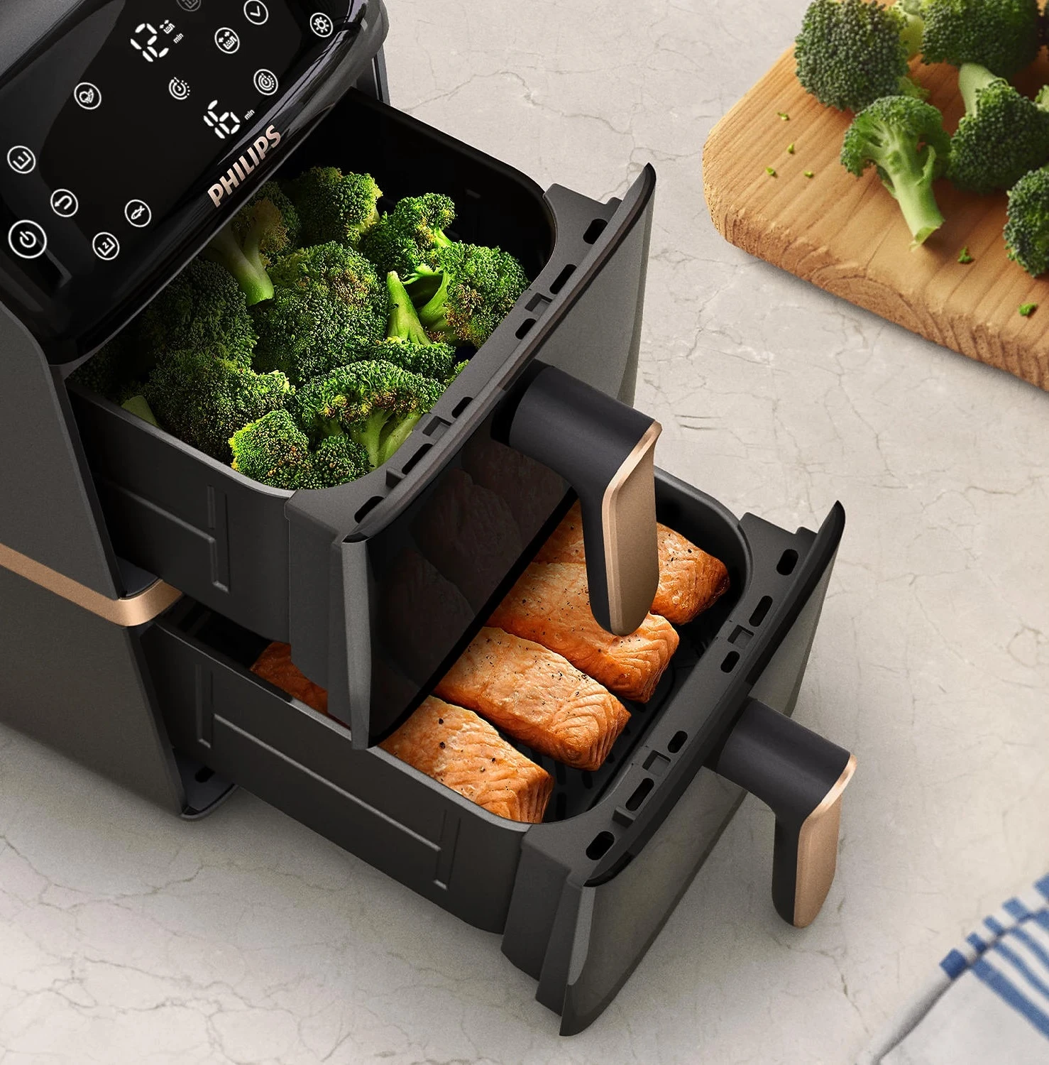 Мультипіч Philips Stacked Dual NA462/70 — це компактна двоярусна аерофритюрниця з подвійним кошиком по 5 л кожен, яка дозволяє готувати дві страви одночасно. Потужність 2300 Вт і технологія RapidAir забезпечують рівномірне приготування з хрусткою скоринкою та мінімальною кількістю олії. Пристрій оснащено сенсорним управлінням, 6 автоматичними програмами та інтелектуальною синхронізацією часу. Завдяки ергономічній конструкції займає на 45% менше місця на кухні.