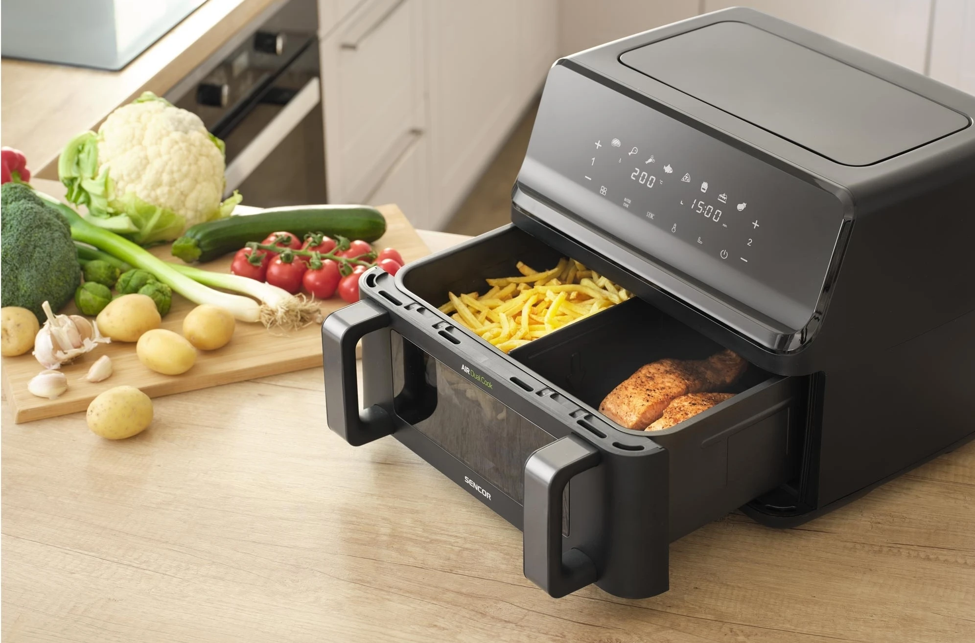Sencor Dual Vita Fryer SFR9650BK із загальною місткістю 9 л та потужністю 2700 Вт готує дві абсолютно різні страви одночасно — кожна зона має власний незалежний температурний контроль у діапазоні 80–200 °C. Знімна тарілка з антипригарним покриттям легко перетворює подвійний кошик на єдиний простір для великих порцій. Функція SyncFinish синхронізує завершення приготування в обох відділеннях, тож усі страви на столі одночасно. Система циркуляції гарячого повітря виключає потребу в олії та мінімізує запахи під час готування.