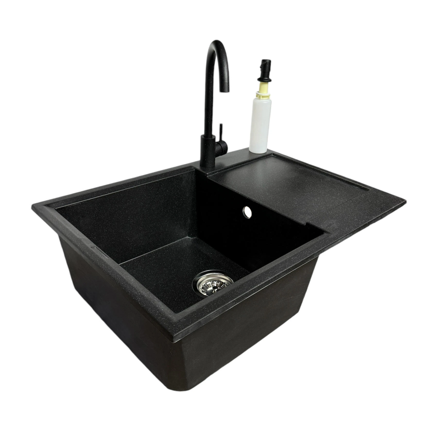 Кухонний набір Adamant Horizon Medium поєднує простору прямокутну мийку зі штучного каменю, змішувач та зручний дозатор. Глибока чаша та широке крило надають комфорт під час миття й підготовки продуктів. Матова поверхня зберігає охайний вигляд і легко очищується. Технологія Solid Surface забезпечує високу міцність та стійкість до впливів. Це універсальне рішення для сучасного та функціонального кухонного простору.