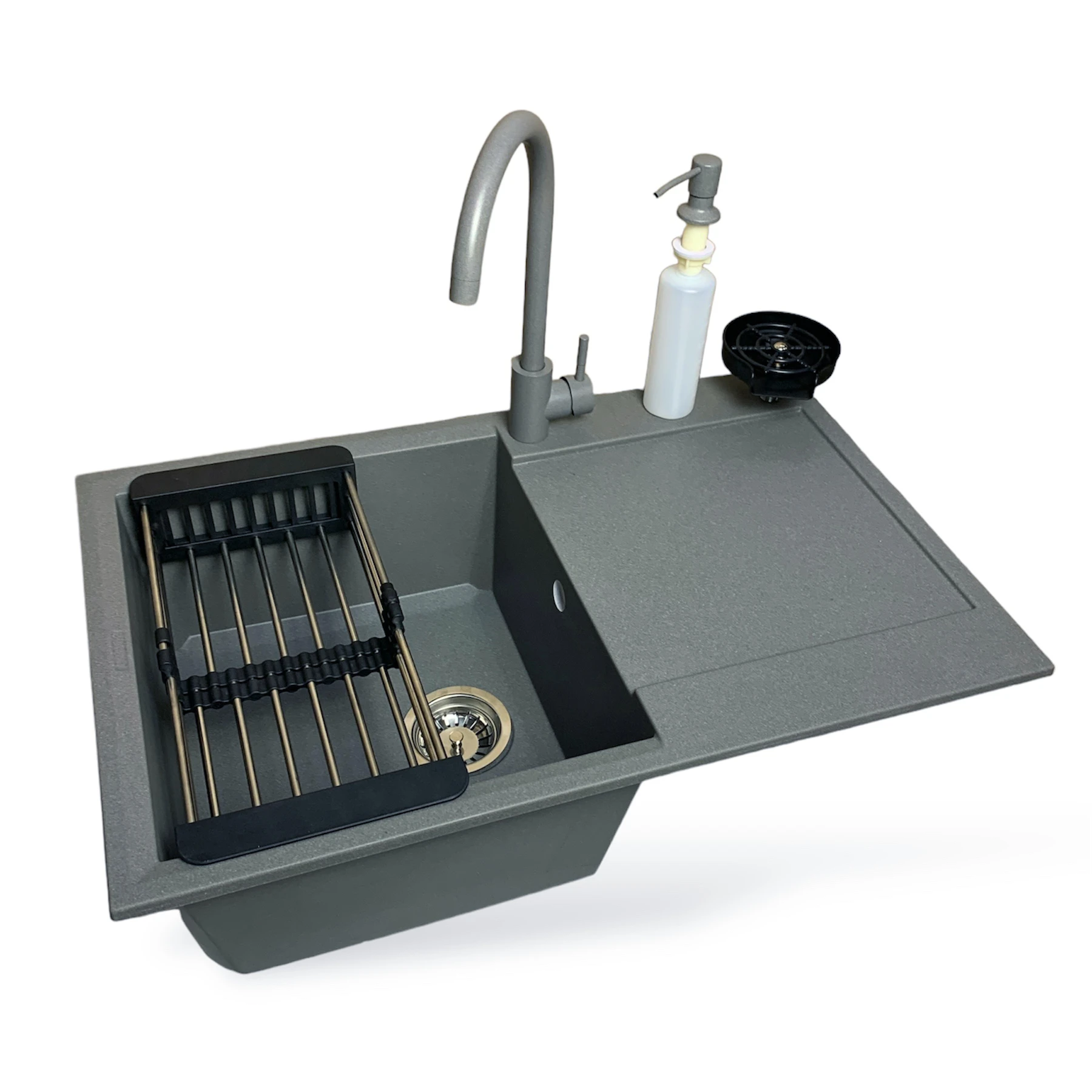 Набір Adamant Horizon поєднує простору мийку зі штучного каменю з крилом, змішувачем та дозатором, створюючи зручний і продуманий кухонний простір. Глибока чаша дозволяє комфортно мити великі каструлі та посуд. Матеріал Solid Surface відзначається стійкістю до температур і щоденних навантажень. Монтаж із нижнім кріпленням забезпечує надійну фіксацію. Це комплексне рішення для сучасної кухні з акцентом на практичність.
