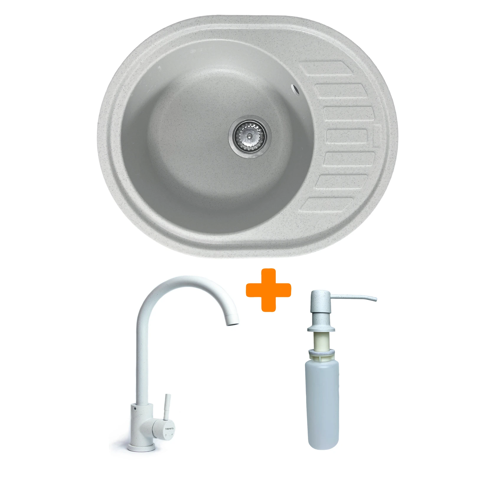 Набір Adamant Ovum складається з овальної врізної мийки зі штучного каменю з крилом, змішувача та дозатора, утворюючи практичне комплексне рішення для кухні. Мийка виконана за технологією Solid Surface, що забезпечує високу стійкість до температур і щоденних навантажень. Глибока чаша зручна для роботи з великим посудом та продуктами. Змішувач і дозатор виготовлені з надійних матеріалів та доповнюють загальну функціональність. Це сучасний набір для тих, хто цінує комфорт і довговічність.
