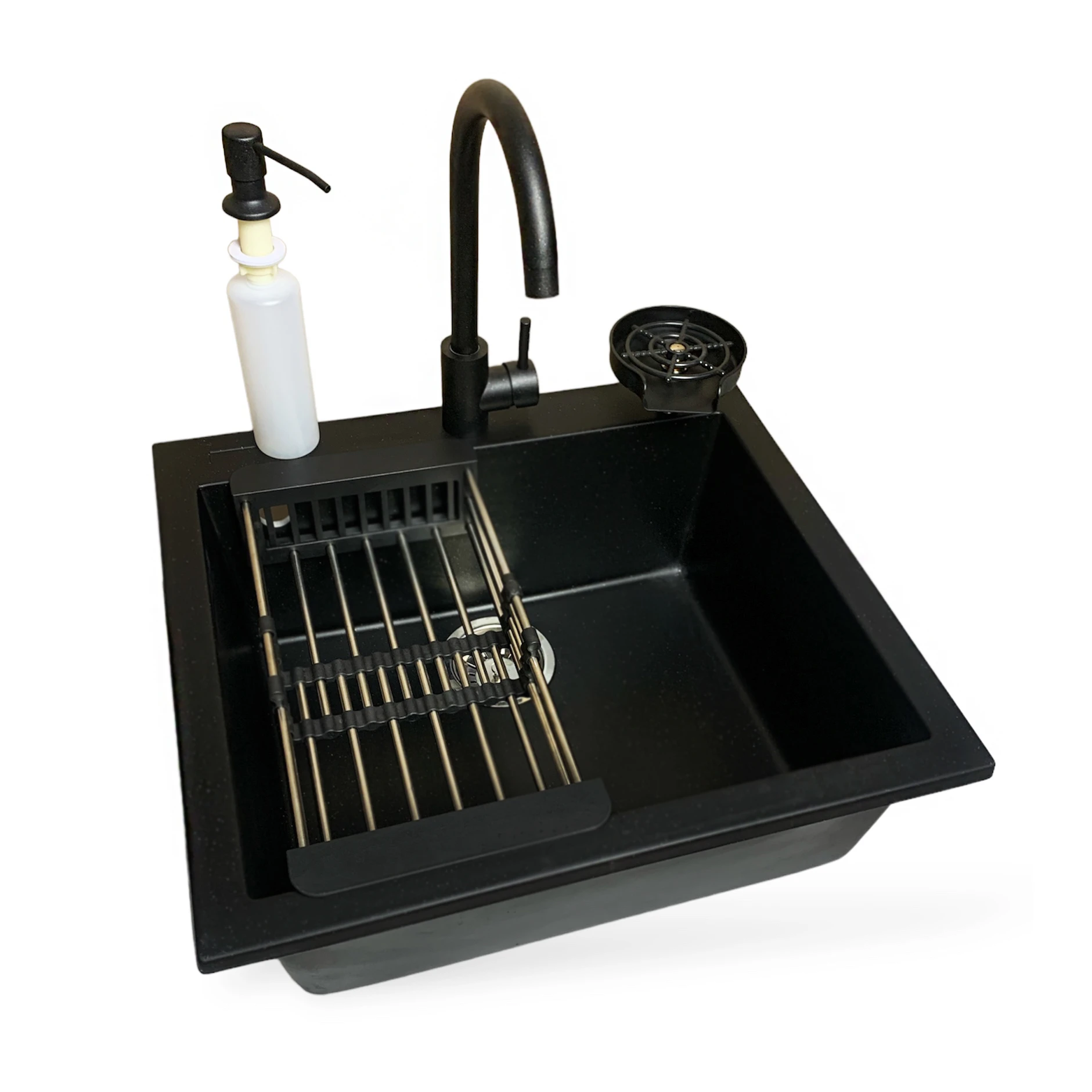 Набір Adamant Univer – це продумане рішення, яке об’єднує мийку зі штучного каменю, змішувач, дозатор, ополіскувач склянок та коландер. Квадратна форма та конструкція без крила дозволяють раціонально використати простір на кухні. Технологія Solid Surface забезпечує високу міцність, стійкість до подряпин і зручність у догляді. Додаткові аксесуари роблять щоденну роботу комфортнішою та підтримують порядок у робочій зоні. Комплект створений для тих, хто цінує функціональність та сучасні матеріали.