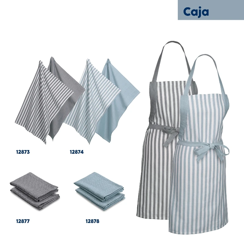 У наборі KELA Caja димчасто-блакитного кольору два кухонні рушники розміру 50х70 см (однотонне і в смужку). Кухонні рушники сумішеві, в їх складі 55% бавовни та 45% бамбука. Бамбук у складі додає рушнику м'якості, поглинаючих та природних антибактеріальних властивостей. Додавання ж бавовни робить рушник більш довговічним та стійким до прання.