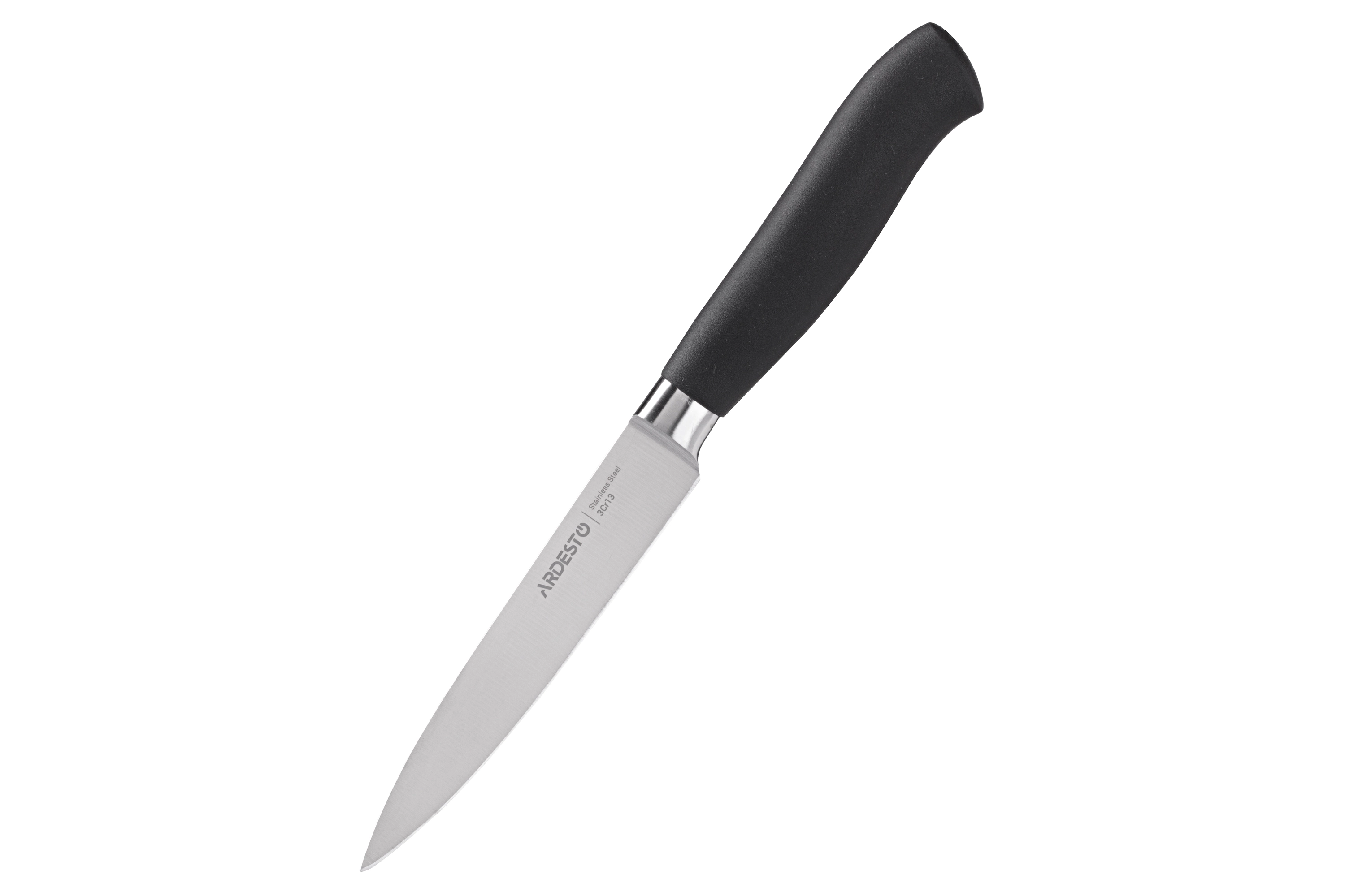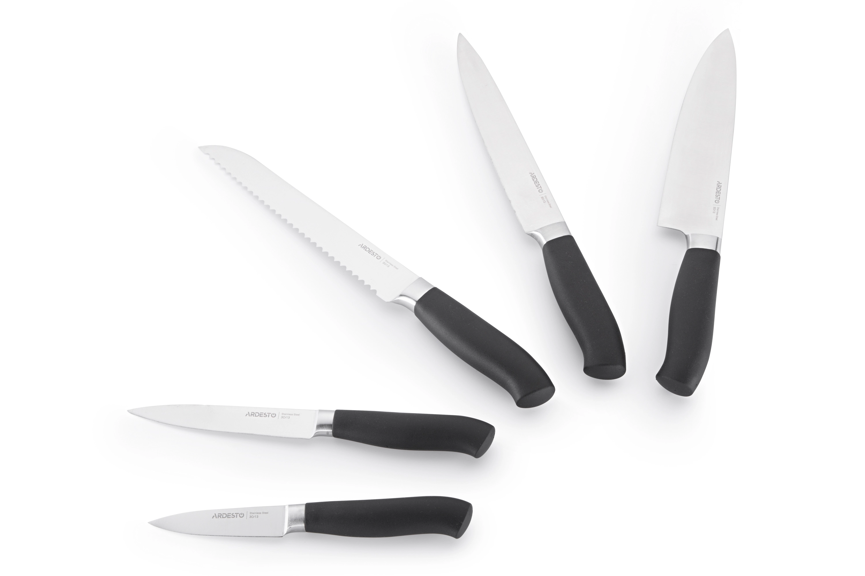 Набір складається з п’яти ножів серії Black Mars, до якого входять універсальний ніж, ніж кухарський, ніж для хліба, ніж для овочів, ніж-слайсер, та дерев’яного блоку. Леза та ручки виготовлені з нержавіючої сталі. Підходить для використання в посудомийній машині.