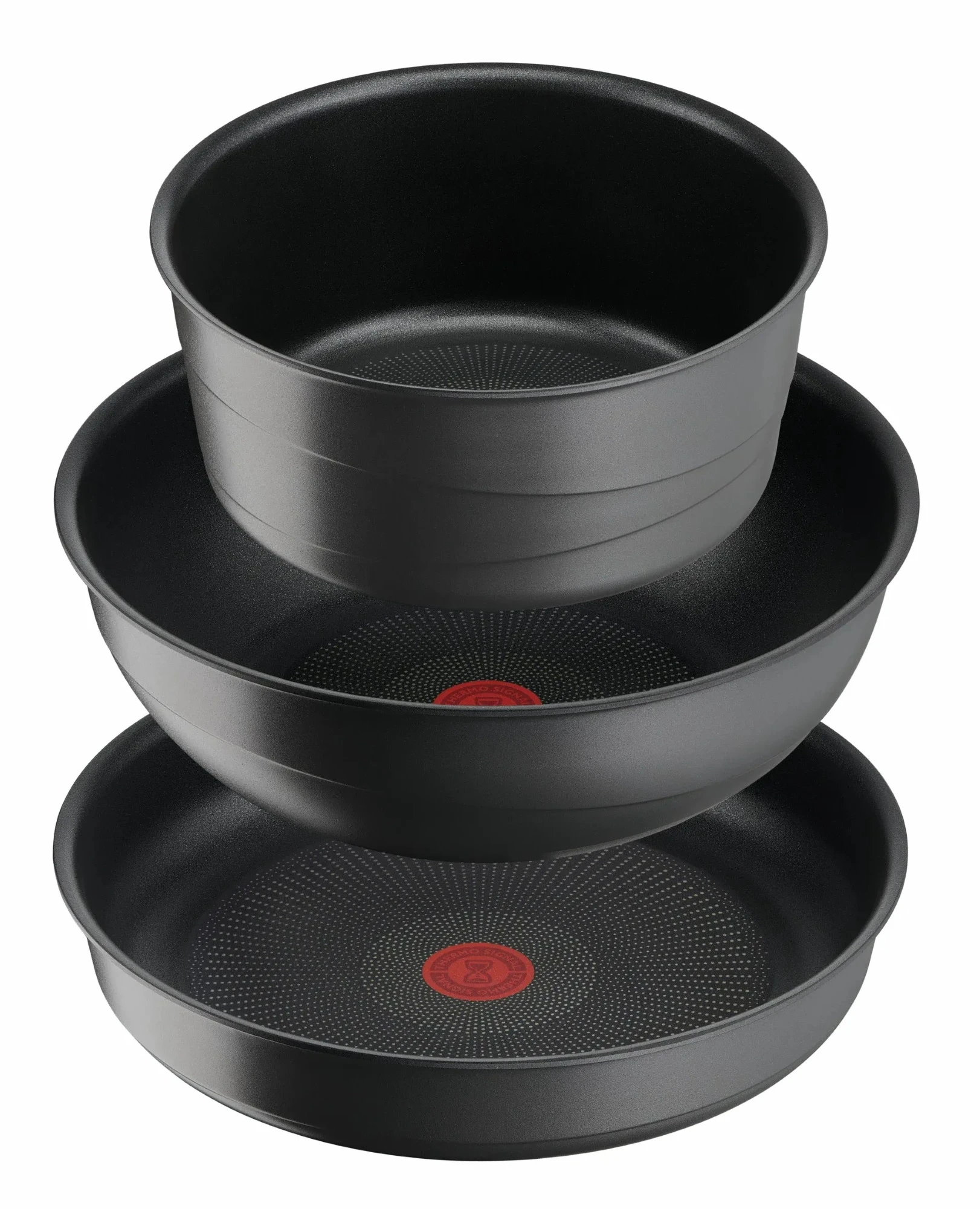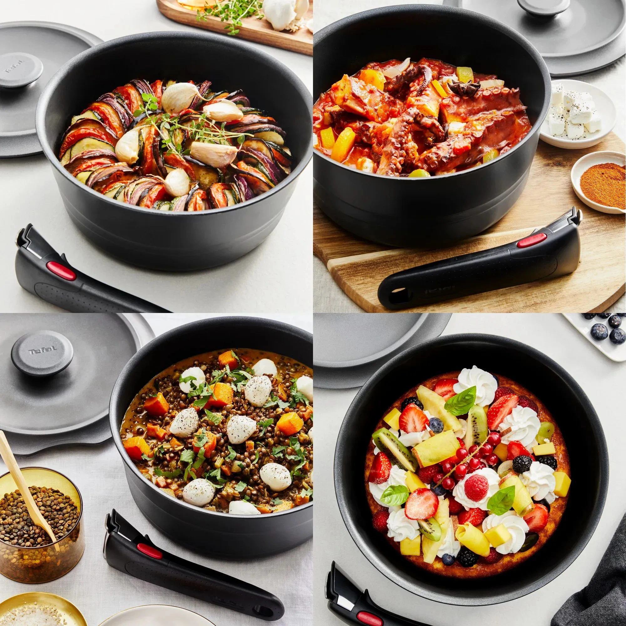 Набір посуду Tefal Ingenio Inspiration з литого алюмінію складається зі сковорідки 26 см, сотейника 20 см, сковороди WOK 26 см, двох кришок та знімної ручки Ingenio. Конструкція дає змогу готувати на плиті, використовувати посуд у духовці та ставити його в холодильник. Антипригарне покриття Titanium 3X спрощує приготування та очищення, а індикатор Thermo-Signal™ допомагає контролювати температуру нагріву.
