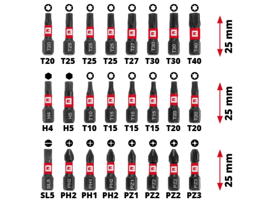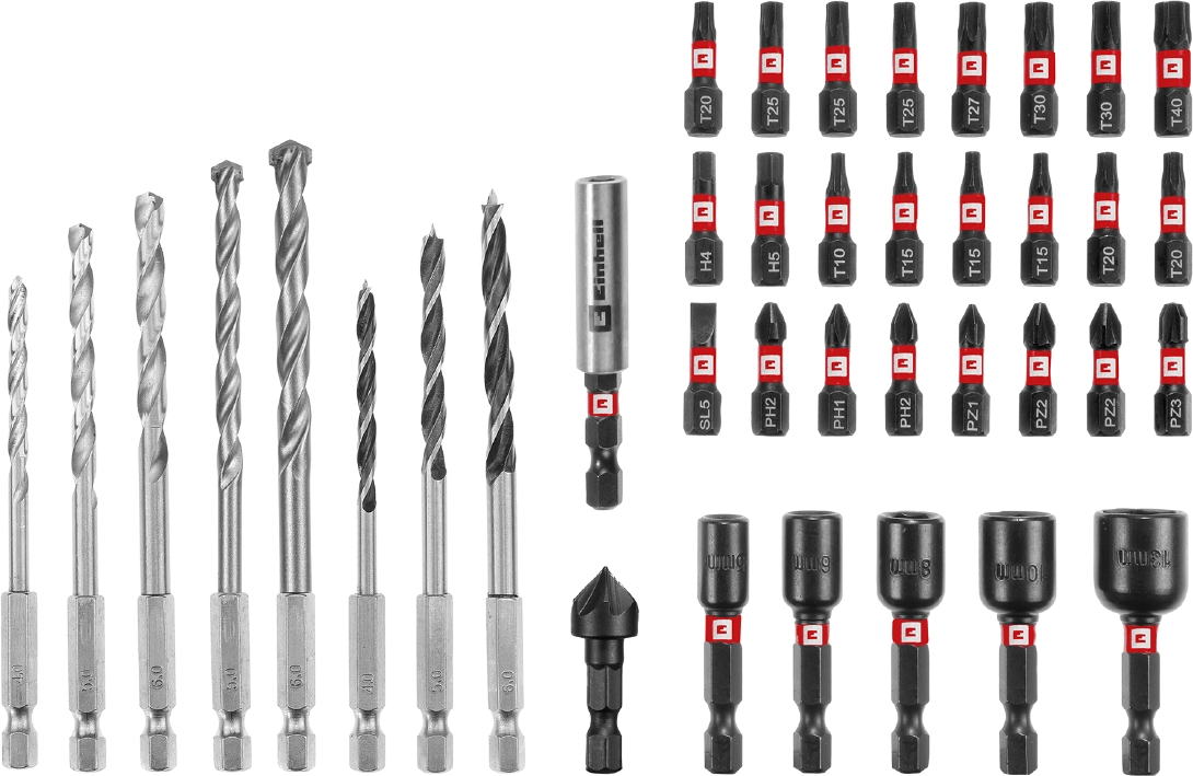 Einhell M-Case (39 од.) — набір для шуруповертів і дрилів: 24 біти 25 мм (C6.3; PH/PZ/SL/T/H; сталь S2, марганцево-фосфатована), 3 свердла по металу HSS 4/5/6 мм (E6.3), 3 по дереву C45 4/5/6 мм, 2 по каменю 6/8 мм, 5 торцевих головок 5–13 мм та магнітний бітотримач. Усе в міцному кейсі з прозорою кришкою та автофіксацією.
