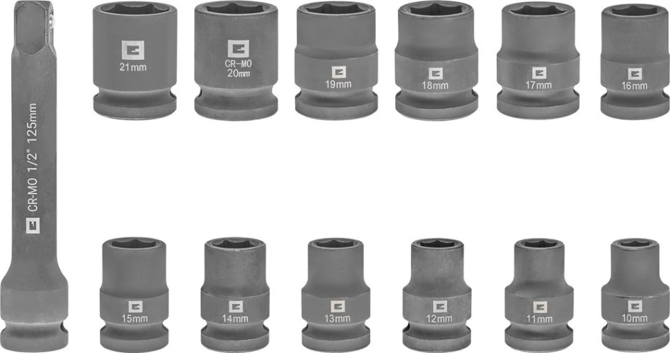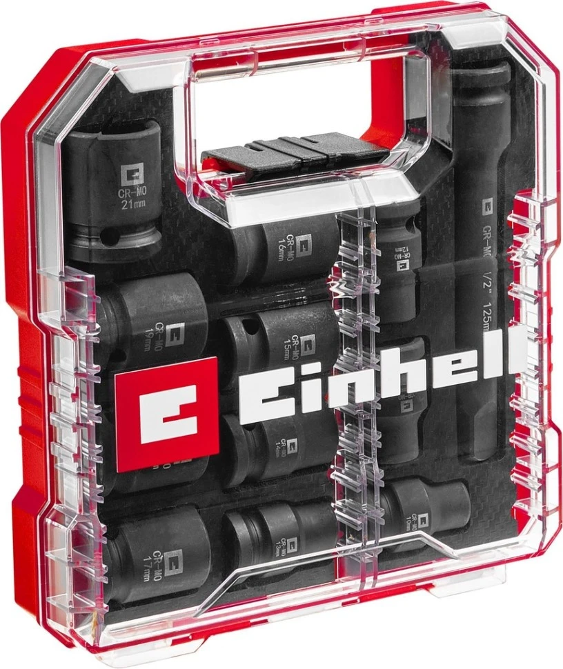Einhell пропонує набір із 12 ударних торцевих головок 1/2" завдовжки 40 мм у розмірах від 10 до 21 мм для роботи в автомобільному секторі та промисловості. Одинадцять шестигранних головок із хроммолібденової сталі з марганцево-фосфатним покриттям витримують високі крутні моменти ударних гайковертів. Подовжувач 125 мм у комплекті розширює доступ до важкодоступних кріплень у шасі та моторному відділенні. Усе зберігається в L-кейсі з EVA-вставкою карбонового дизайну. Маса — 0,78 кг.