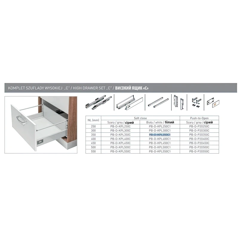 Напрямні GTV MODERN BOX PB-D-KPL500C1 — це сучасна система для монтажу високих висувних ящиків у білому кольорі, розрахована на глибину шафи 500 мм. Вона поєднує в собі надійність, зручність у щоденному використанні та стильний вигляд. Ідеальне рішення для кухонних меблів, ванних кімнат, гардеробів і комодів.