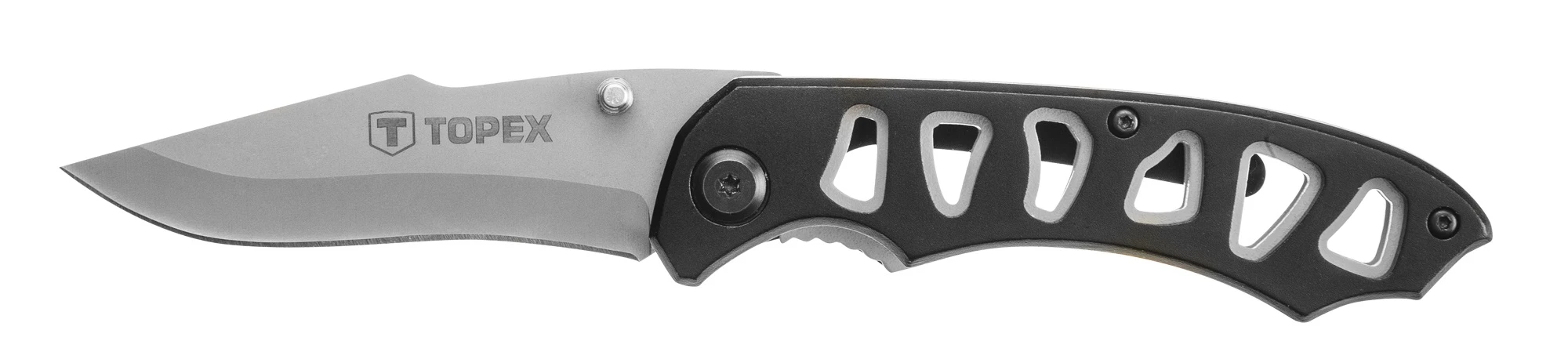 Універсальний складаний ніж Topex характеризується багатьма універсальними функціями. Анодований алюміній, із якого виготовлений корпус, забезпечує міцність і стійкість до корозії. Спеціальний важіль блокує лезо від самочинного складання. Чохол із міцного нейлону спрощує зберігання та транспортування. Марка TOPEX адресована майстрам.