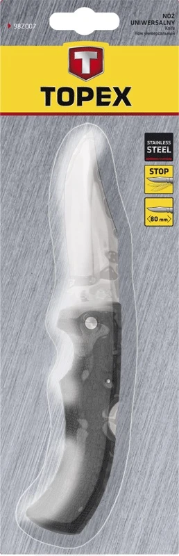 Ніж універсальний TOPEX довжиною леза 90 мм. Корпус і лезо виготовлені з високоякісної загартованої нержавіючої сталі, що забезпечує подовжений термін експлуатації інструмента. Захист вістря забезпечує безпеку під час експлуатації. Гумована ручка ергономічної форми зручно міститься в долоні, не вислизаючи, що підвищує комфорт праці ножем. Можливість складання спрощує зберігання та транспортування. Марка TOPEX адресована майстрам, які займаються дрібним ремонтом.