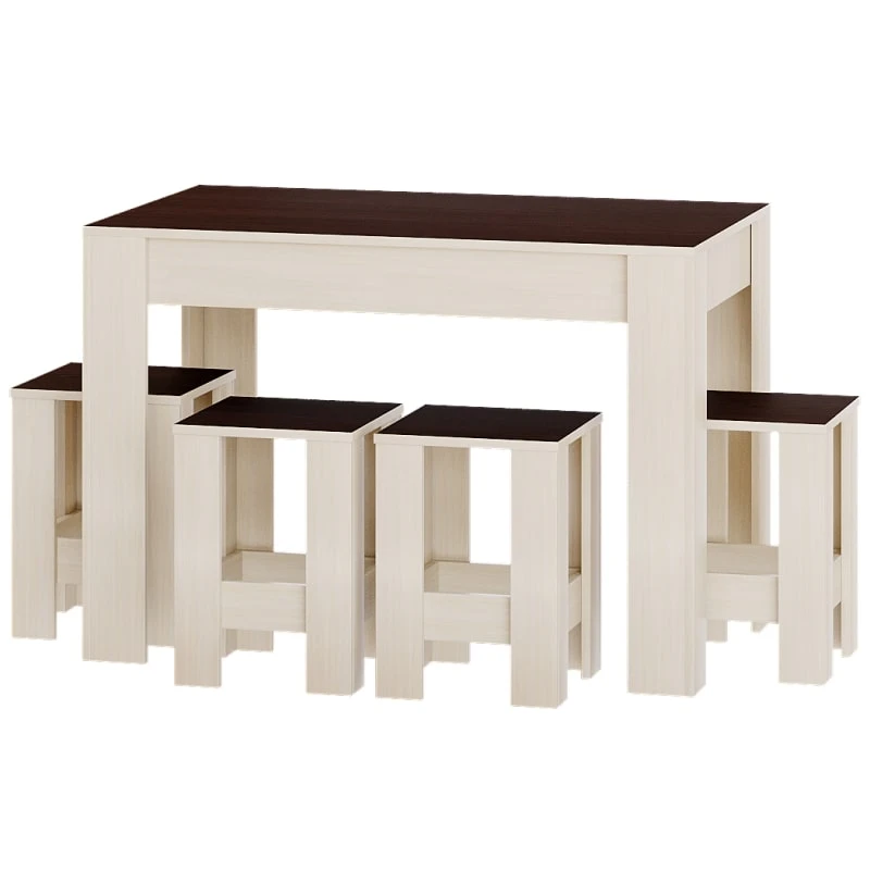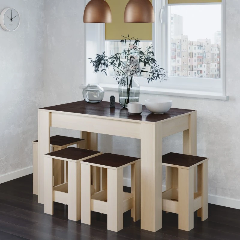 Відкрийте для себе обідній комплект Еверест, який поєднує в собі елегантний дизайн та практичність. Стіл СТО-1 в комплекті з чотирма табуретами Т-1 створить затишну атмосферу для сімейних обідів і зустрічей з друзями. Темний венге в поєднанні з молочним дубом додає естетичної привабливості, що підкреслить ваш інтер'єр, створюючи стильний акцент у будь-якому приміщенні.