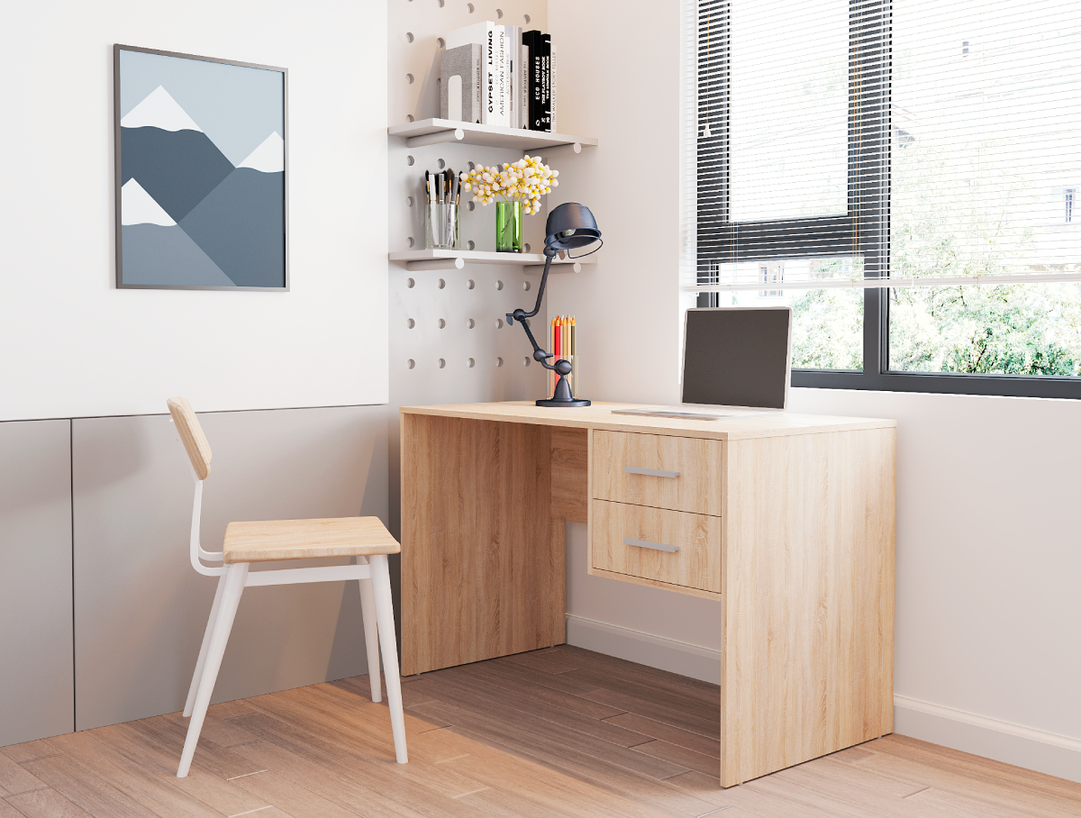 Стіл оснащений двома висувними ящиками, що дозволяють зберігати канцелярські прилади або інші важливі речі під рукою. Виготовлений з високоякісних матеріалів від виробника Swiss Krono, цей стіл є надійним і довговічним вибором для вашого офісу чи домашнього кабінету.