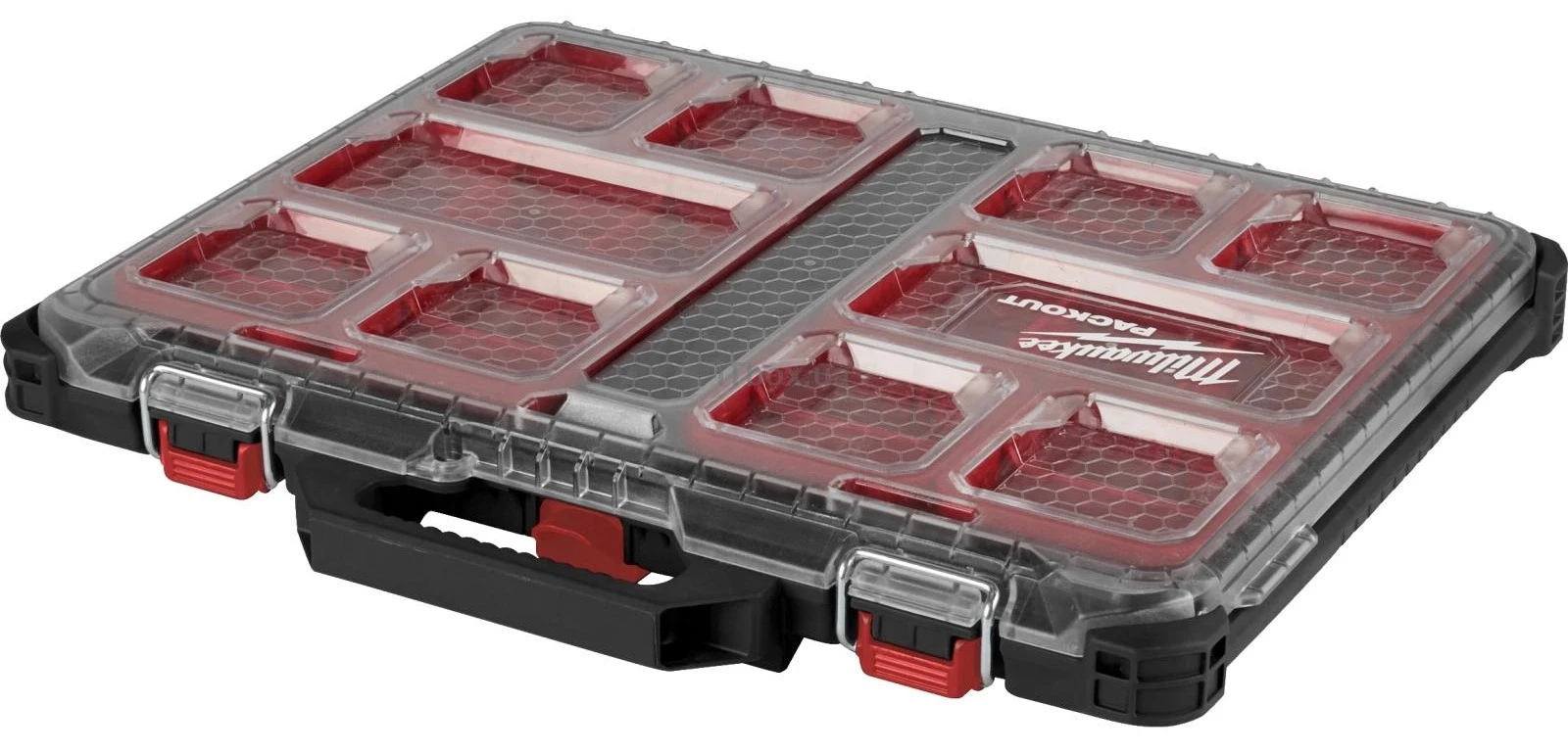 Органайзер Milwaukee Packout є частиною модульної системи Packout для зручного зберігання та транспортування аксесуарів. Модель оснащена 8 змінними контейнерами для сортування дрібних деталей. Прозора кришка й ударостійкий корпус забезпечують надійну роботу в різних умовах.