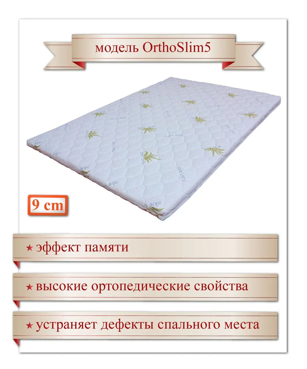 Тонкий ортопедичний матрац OrthoSlim5 – найкраща пропозиція серії! Даний матрац здатен вирівняти та покращити практично будь-яку поверхню. Верхній шар матрацу виготовлений з м’якої та комфортної піни Memory, під якою знаходиться жорстка основа з кокосової койри та симтексу. Завдяки жорсткій основі та м’якій поверхні створюється надзвичайно комфортне і правильне з ортопедичної точки зору спальне місце. Даний матрац дозволяє відчути всі переваги якісних ортопедичних матраців. По кутках матрацу є резинки для надійного кріплення. При потребі OrthoSlim5 можна використовувати як самостійний матрац або гостьове спальне місце. Матрац OrthoSlim5 не згортається. Піна Memory foam з ефектом пам'яті – сучасний анатомічний матеріал. Завдяки ефекту облягання тіла - максимально розслаблюються м'язи, знімається напруга і забезпечується правильне положення хребта. Крім того піна Memory пом'якшує спальне місце, для більш комфортного відпочинку. Піна м'яко обволікає тіло, створюючи ефект занурення. Під шаром Memory знаходиться шар кокосової койри, що забезпечує додаткову підтримку, вирівнює поверхню та приховує дефекти спального місця. Кокосова койра – відмінний природний матеріал, який додає матрацу жорсткість, сприяє додатковій вентиляції і правильному положенню під час сну. Нижній шар матрацу виготовлений із щільного ортопедичного матеріалу - сімтексу, що добре вирівнює поверхню та прибирає дефекти спального місця. М'який і приємний чохол "Алое віра" з ефектом "Зима/Літо" зігріває взимку і добре "дихає" влітку. Для досягнення ефекту "Зима/Літо" тканина стрейч-трикотаж, прошивається натуральною бавовною з літнього боку і натуральною шерстю з зимової. Чохол знімний на блискавці, його можна прати. Замовте цей матрац на нашому сайті — ми забезпечимо швидке виготовлення та доставку, оскільки ми є його виробником!