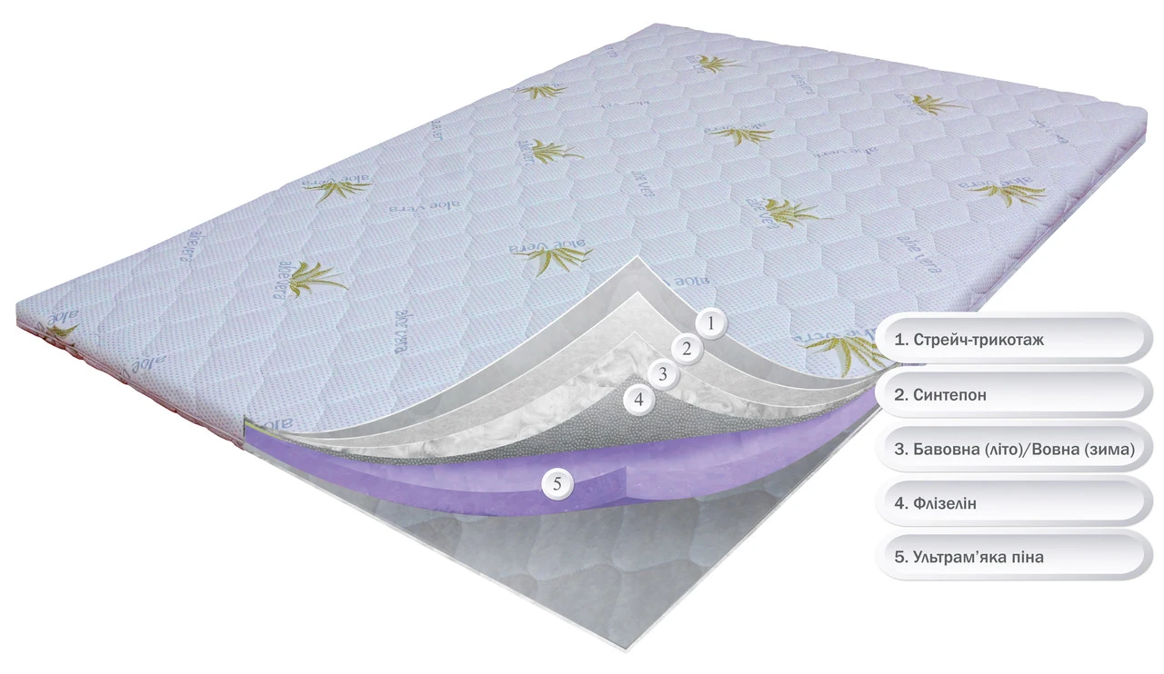 Тонкий ортопедичний матрац OrthoSlim6 з ультрам’якою піною, призначений для пом’якшення та надання анатомічних властивостей спальному місцю. Матрац використовується на диванах та матрацах які виявились занадто жорсткими. Використання матрацу OrthoSlim6 з ультрам’якою піною значно покращить рівень комфорту та користі вашого дивану або матрацу, та дозволить дійсно насолоджуватись відпочинком. По кутках матрацу є резинки для надійного кріплення. Матрац дуже легко згортається. Дана модель здатна приховати незначні дефекти спального місця. В основі матрацу використовується ультрам'яка піна, яка завдяки своїм анатомічним властивостям, підтримує тіло в кожній точці, розслабляє м’язи та сприяє максимально комфортному відпочинку. М'який і приємний чохол "Алое віра" з ефектом "Зима/Літо" зігріває взимку і добре "дихає" влітку. Для досягнення ефекту "Зима/Літо" тканина стрейч-трикотаж, прошивається натуральною бавовною з літнього боку і натуральною шерстю з зимової. Чохол знімний на блискавці, його можна прати. Замовте цей матрац на нашому сайті — ми забезпечимо швидке виготовлення та доставку, оскільки ми є його виробником!