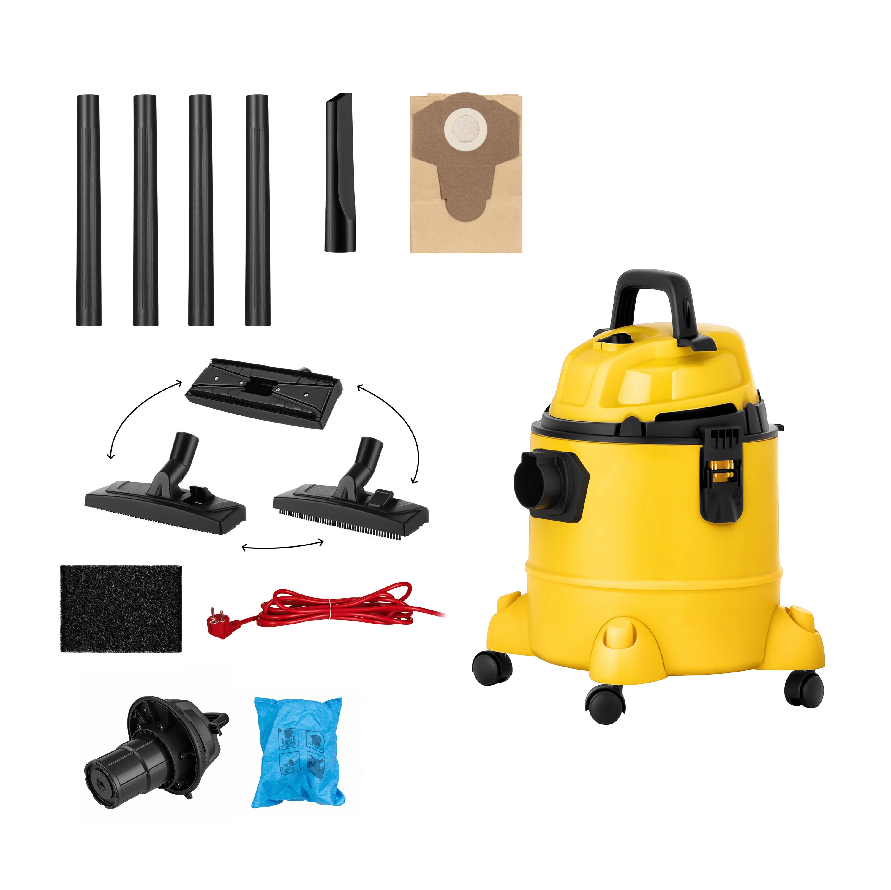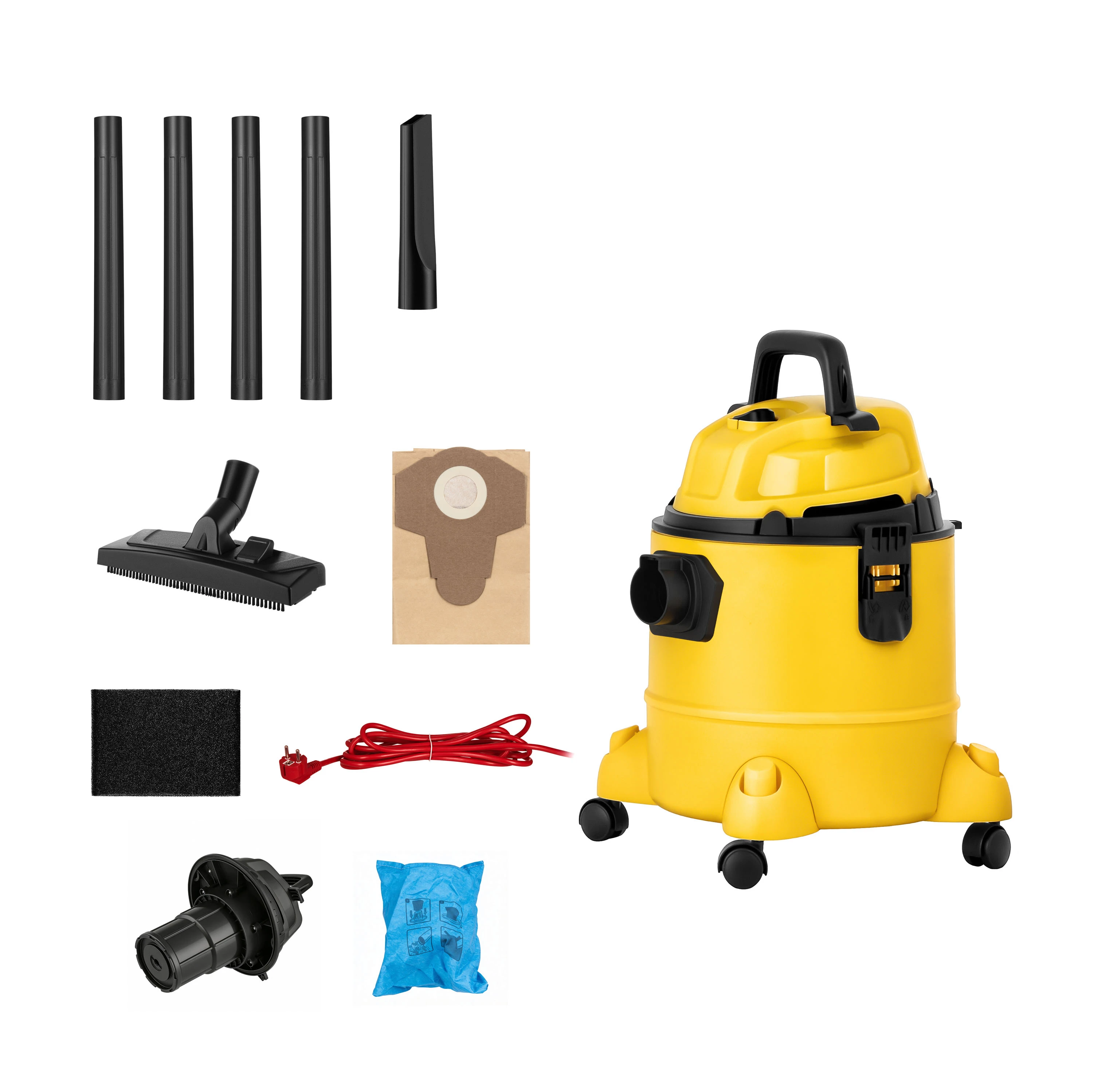 - Комплектація шланг; насадка для підлоги; щілинна насадка; паперовий мішок; губчастий фільтр; пилосос професійний;