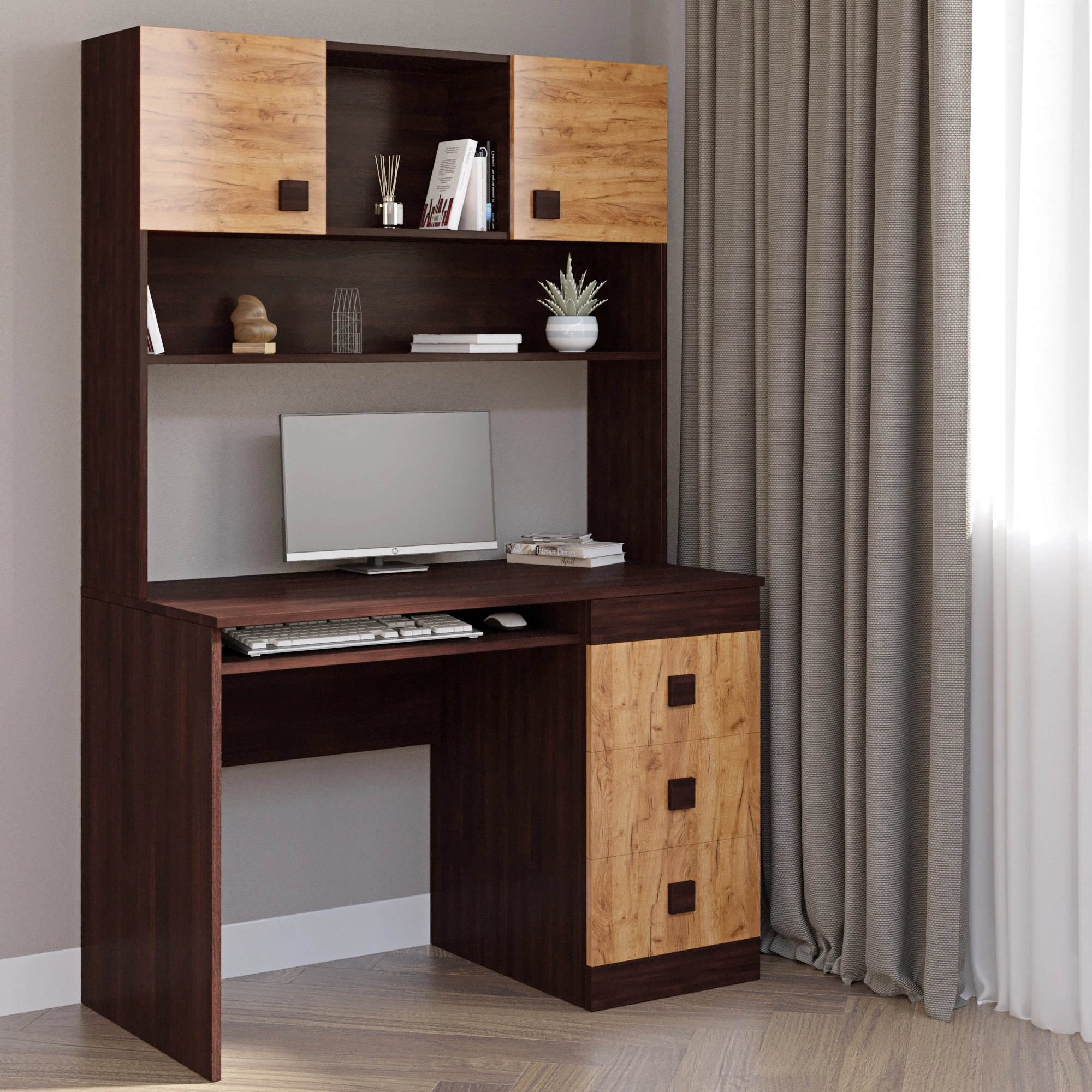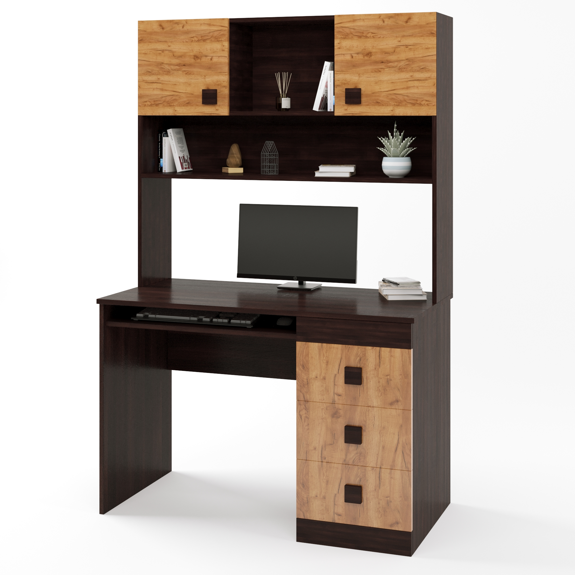 Ваша робота заслуговує на найкраще! Письмовий стіл з надбудовою Еверест Соната не лише підкреслить ваш стиль, але й забезпечить комфорт і зручність під час виконання завдань. Завдяки продуманому дизайну та елегантному поєднанню темного венге і дуба крафт золотого, цей стіл стане справжньою окрасою вашого робочого простору.
