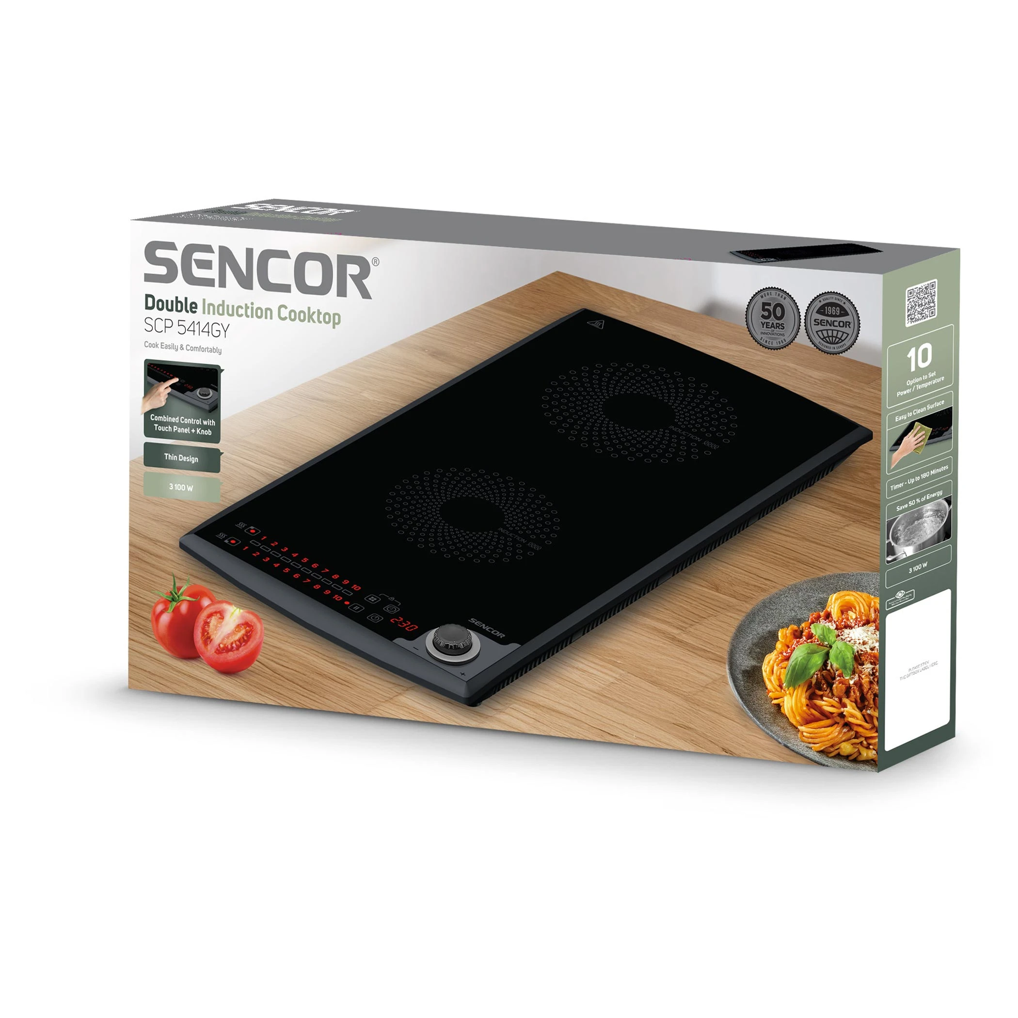 Індукційна плита Sencor SCP 5414GY з двома конфорками забезпечує ефективне приготування завдяки потужності 3100 Вт. Комбінація сенсорного та механічного керування спрощує роботу, а десять рівнів температури дозволяють точно регулювати нагрівання. Таймер надає змогу встановлювати час приготування до трьох годин. Компактна конструкція зручно розміщується навіть у невеликому просторі.