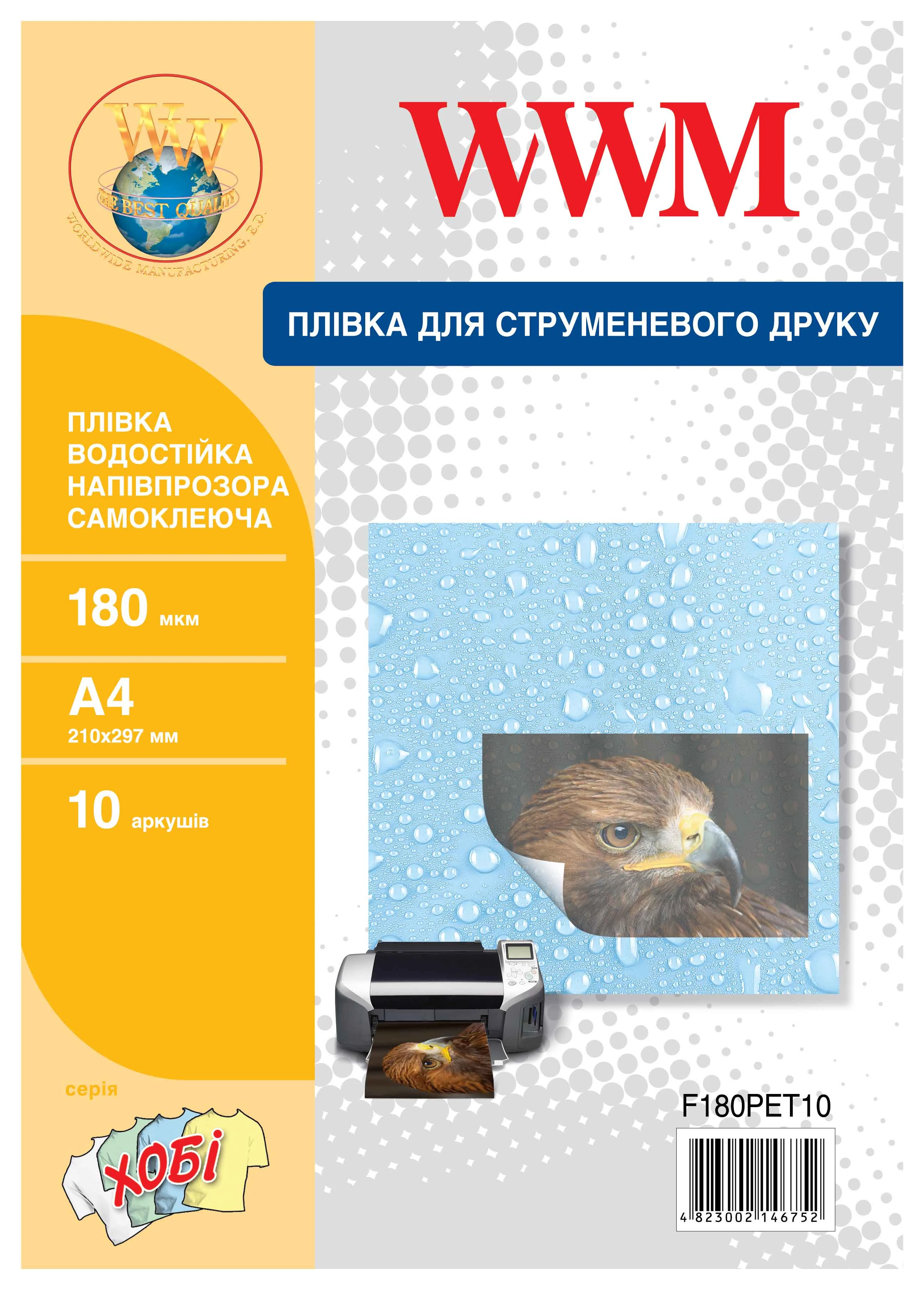 Плівка WWM водостійка напівпрозора самоклеюча 180мкм, A4, 10л (F180PET10)