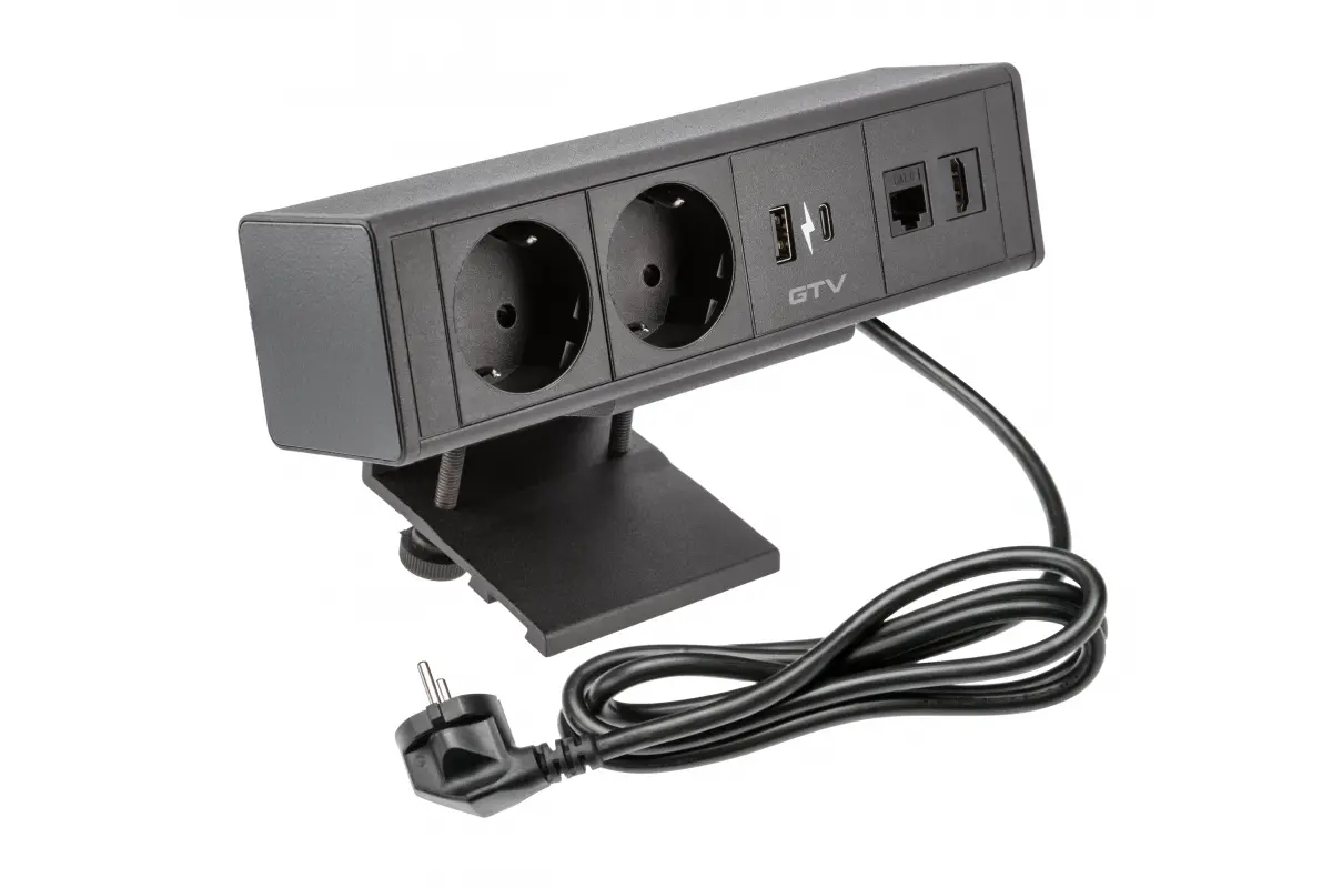 Подовжувач GTV прямокутний BAR, 2xSCHUKO, 1xUSB, 1xTYPE-C, 1xLAN, 1xHDMI, кабель з 1,5м, Чорний