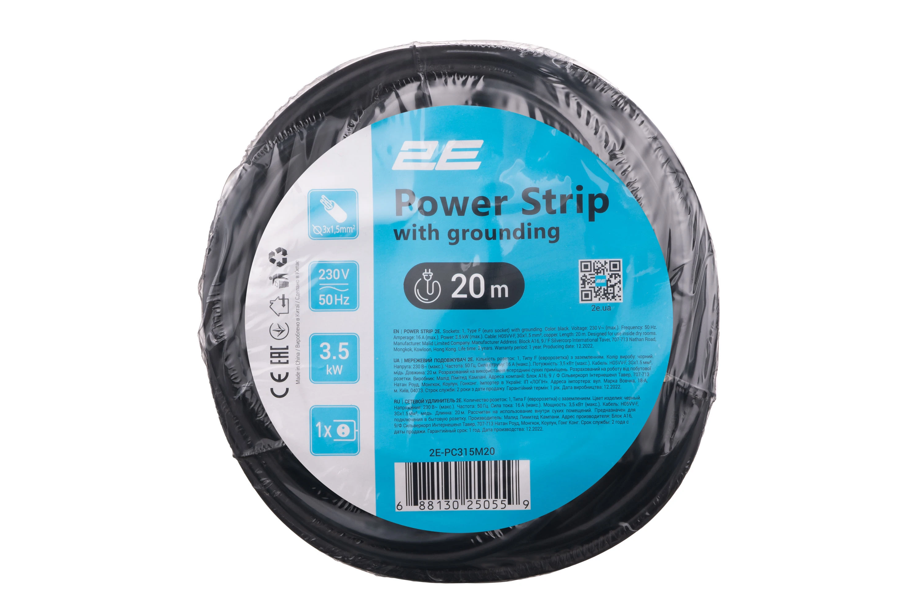 Мережевий подовжувач 2E довжиною 20 м оснащений однією розеткою типу F із заземленням. Кабель H05VV-F із мідним провідником і перерізом 1.5 мм² забезпечує стабільну передачу електроенергії. Розрахований на навантаження до 3.5 кВт і струм до 16 А. Підходить для підключення побутових і робочих електроприладів на відстані. Чорний колір корпусу практичний у щоденному використанні.