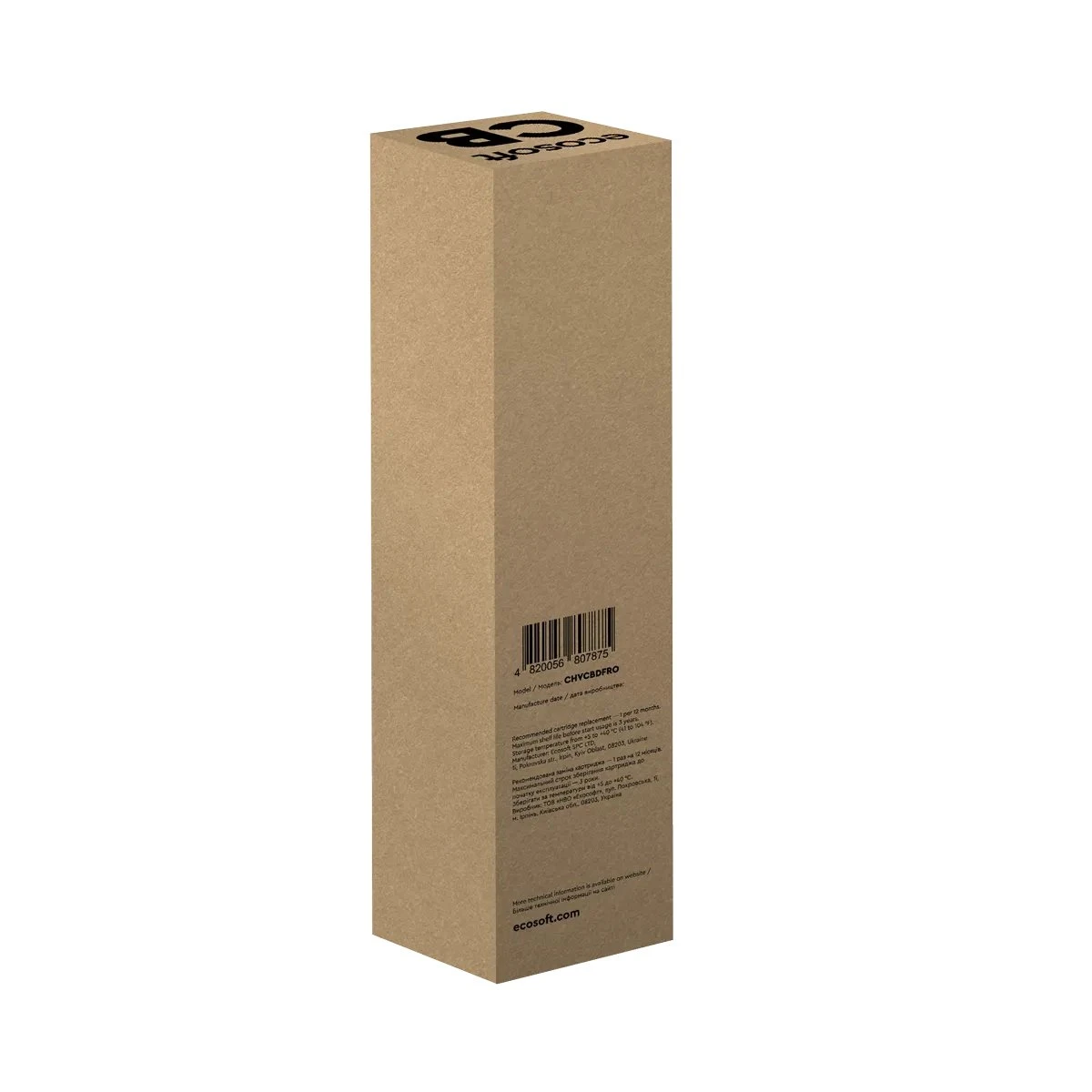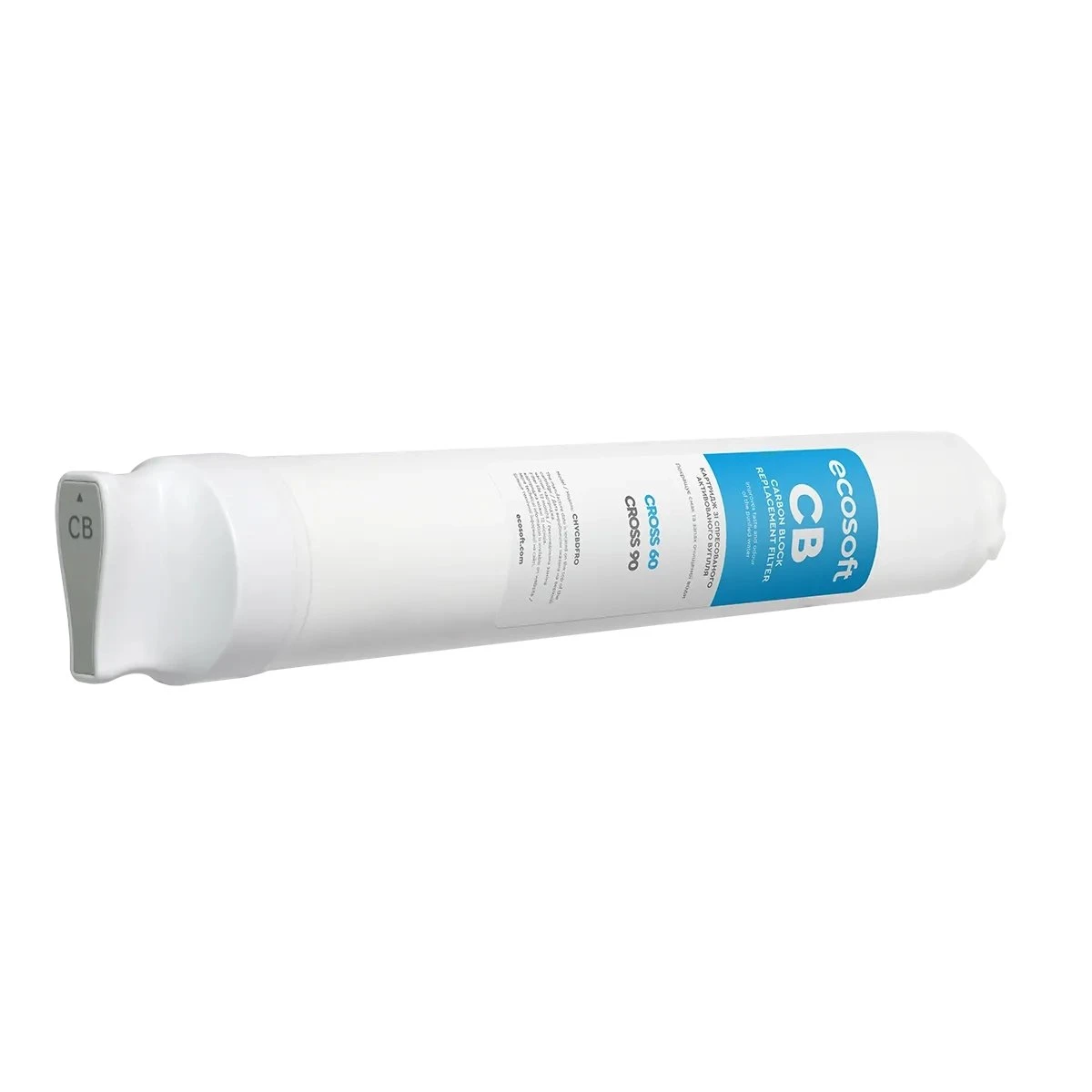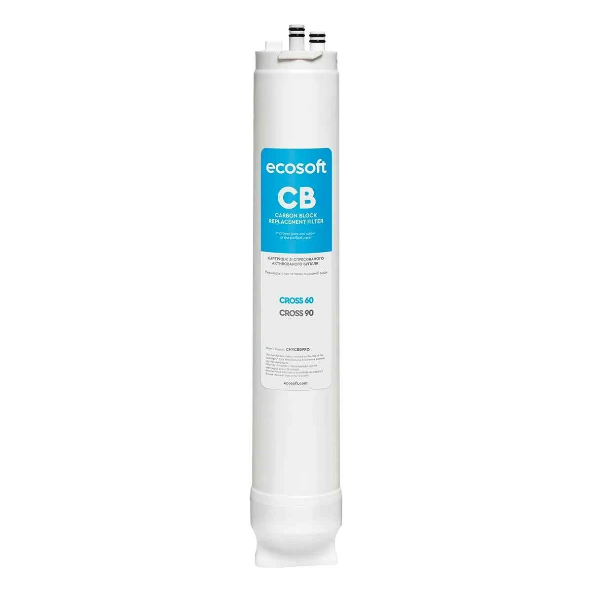 Постфільтр Ecosoft для системи CROSS90 виконує фінальний етап доочищення питної води після мембрани зворотного осмосу. Картридж містить спресоване активоване кокосове вугілля, яке покращує смак і запах очищеної води. Конструкція передбачає легку «суху» заміну без контакту з водою. Smart-індикація системи повідомляє про стан змінного елемента та необхідність його заміни. Рекомендований ресурс картриджа — до 12 місяців використання.