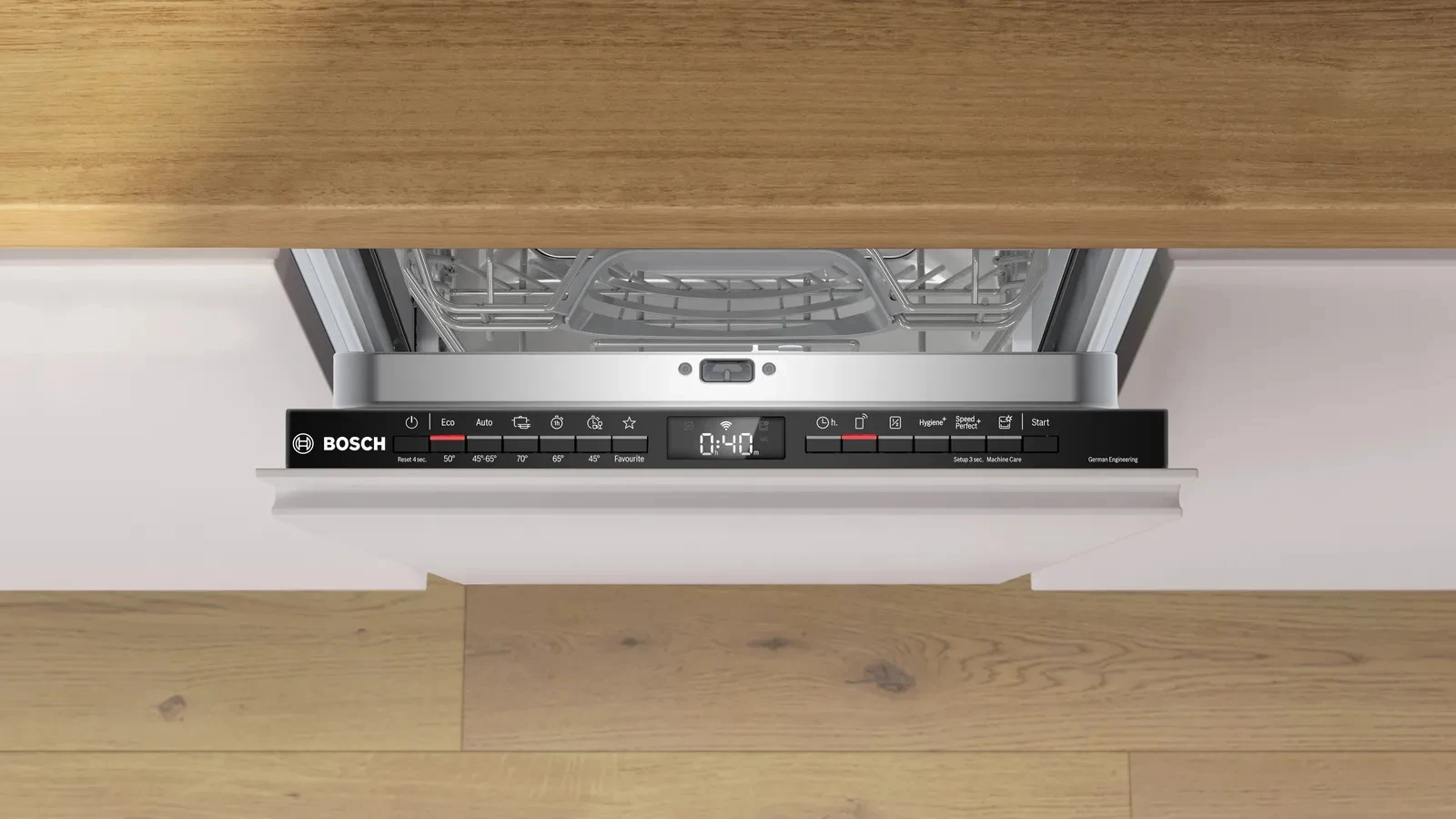Вбудована вузька посудомийна машина Bosch SPV4HMX14Q із підключенням Home Connect: дистанційний запуск, push-сповіщення, «Улюблене» та Easy Start. Опція SpeedPerfect+ скорочує тривалість циклу, Heat Exchanger дбайливо миє скло й фарфор, Self Cleaning Filter зменшує потребу в ручному очищенні фільтра. Стопори нижнього короба роблять завантаження зручнішим.