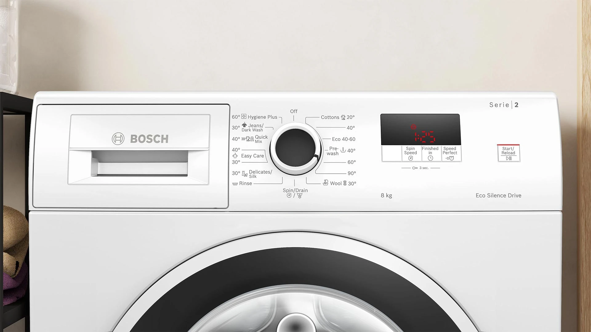 Фронтальна пральна машина Bosch вміщує до 8 кг білизни та має швидкість віджиму до 1200 об/хв. Дисплей відображає хід програми, залишковий час та швидкість віджиму. Програми включають бавовну, синтетику, вовну та делікатні тканини. EcoSilence Drive забезпечує тиху та довговічну роботу, а ActiveWater Plus оптимізує використання води. Сенсорні кнопки TouchControl спрощують вибір опцій і дозавантаження білизни.