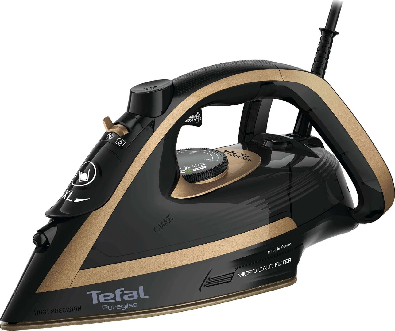 Парова праска Tefal Puregliss Coppertinto & Black FV8064E0 забезпечує винятковий догляд за одягом завдяки поєднанню потужної подачі пари та розширених функцій. Дивовижна потужність для ідеального прасування: потужність 3000 Вт для швидкого нагріву, постійна подача пари 50 г/хв та паровий удар 280 г/хв для легкого розгладження складок. Наша запатентована технологія Micro Calc Filter забезпечує тривалу роботу, зберігаючи весь ваш одяг та постільну білизну бездоганними та захищеними від плям.