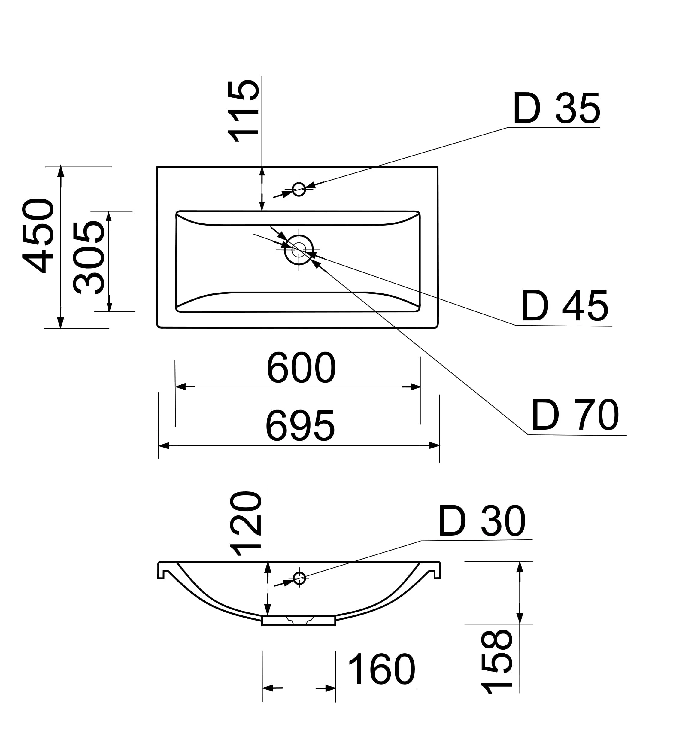 - Особливості з переливним отвором; технологія Solid Surface;