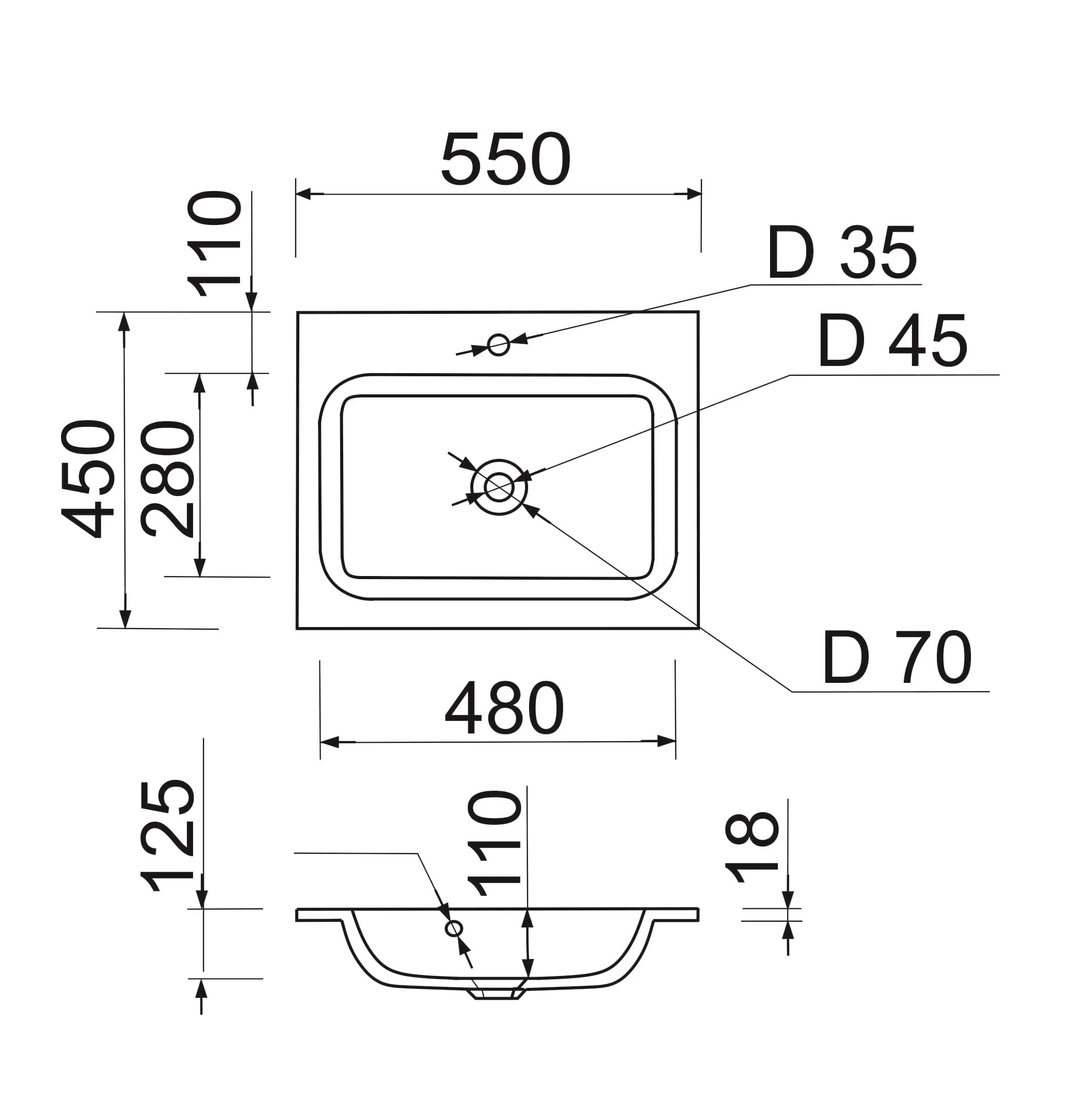 Раковина Adamant FRATE має прямокутну форму, виготовлена зі штучного каменю з розмірами 550 x 450 x 125 мм та білим кольором. Накладний тип встановлення з отворами для змішувача та переливу дозволяє монтаж на тумбу. Матеріал створений за технологією Solid Surface, стійкий до впливу та довговічний.