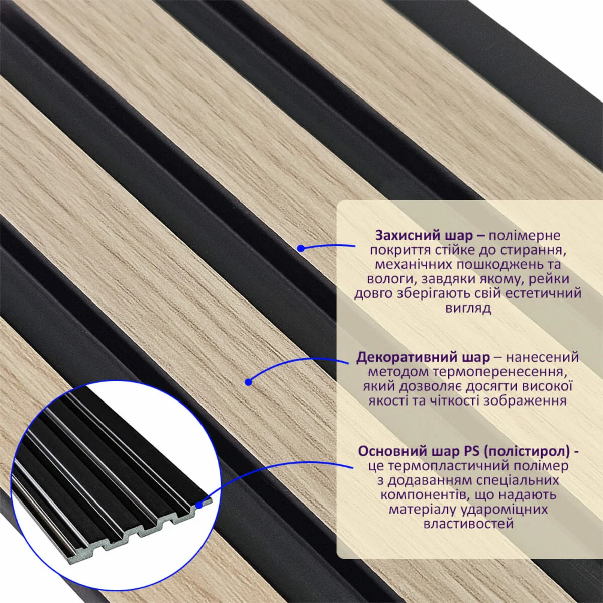 - Захисний шар – полімерне покриття стійке до стирання, механічних пошкоджень та вологи, завдяки якому, рейки довго зберігають свій естетичний вигляд.