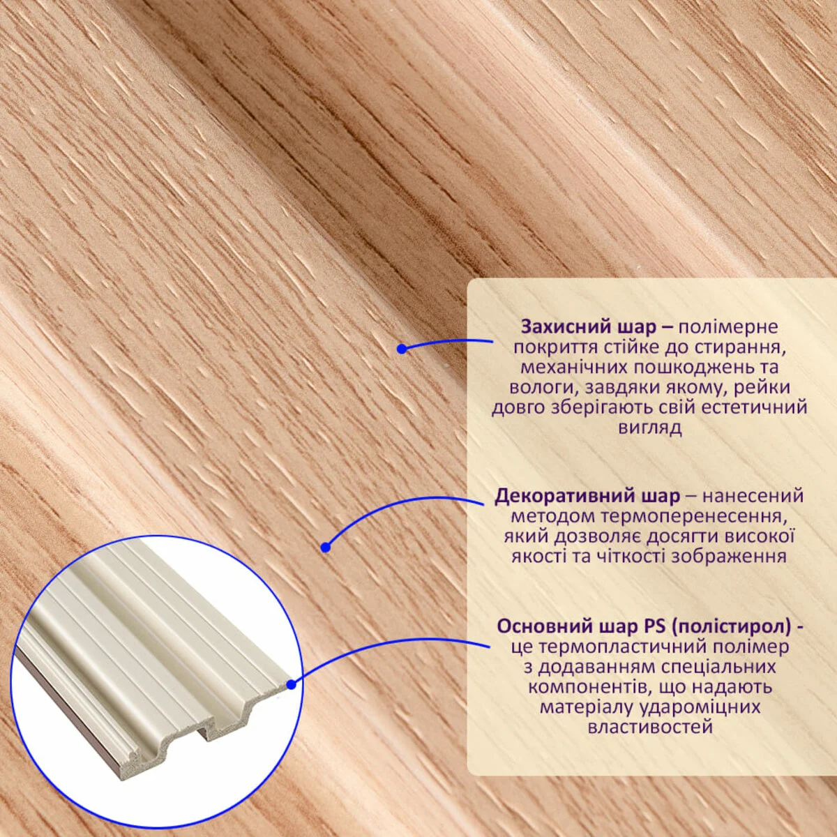 - Захисний шар – полімерне покриття стійке до стирання, механічних пошкоджень та вологи, завдяки якому, рейки довго зберігають свій естетичний вигляд.