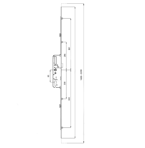 Це дверний врізний механізм із багатоточковою будовою та рейкою довжиною 2200 мм, оснащений фалевою защіпкою та ригельним вузлом для щільного притискання полотна і стабільної фіксації у замкненому стані. Модель призначена для металопластикових, алюмінієвих та металевих дверей, забезпечує рівномірний розподіл притискного зусилля по висоті та покращує захист від віджимання.