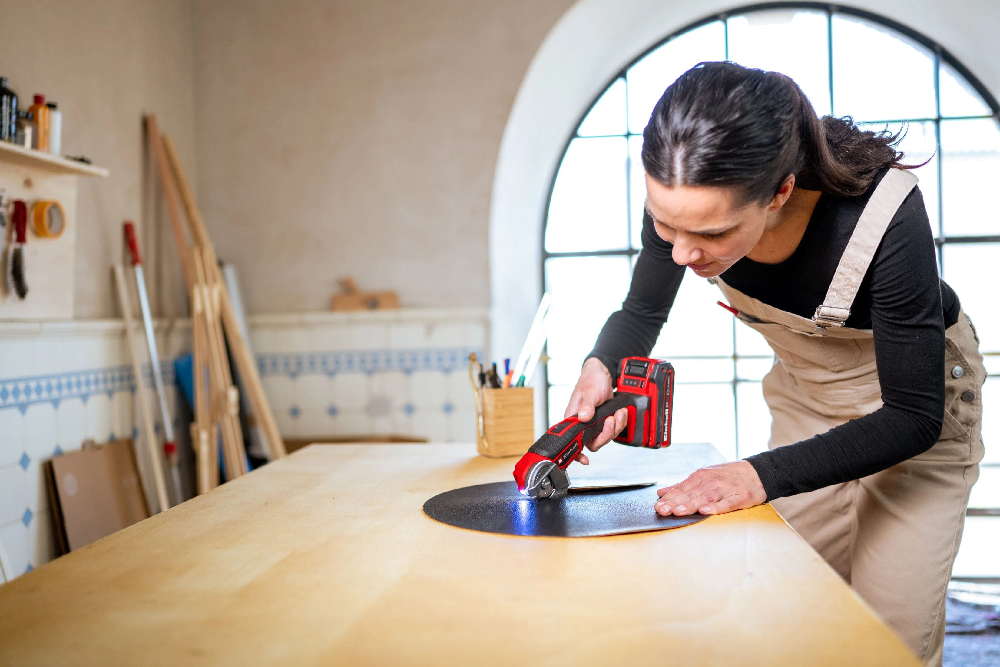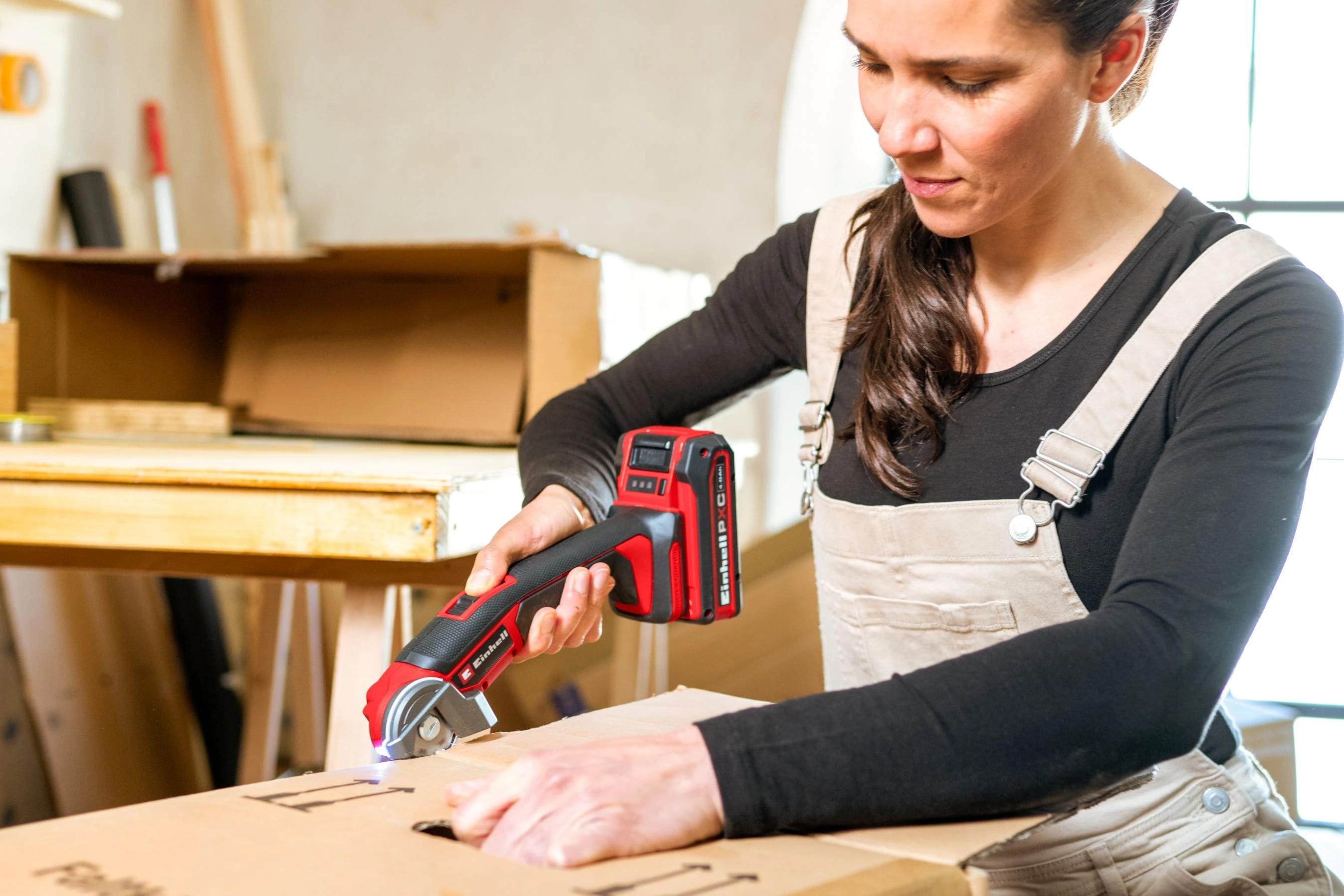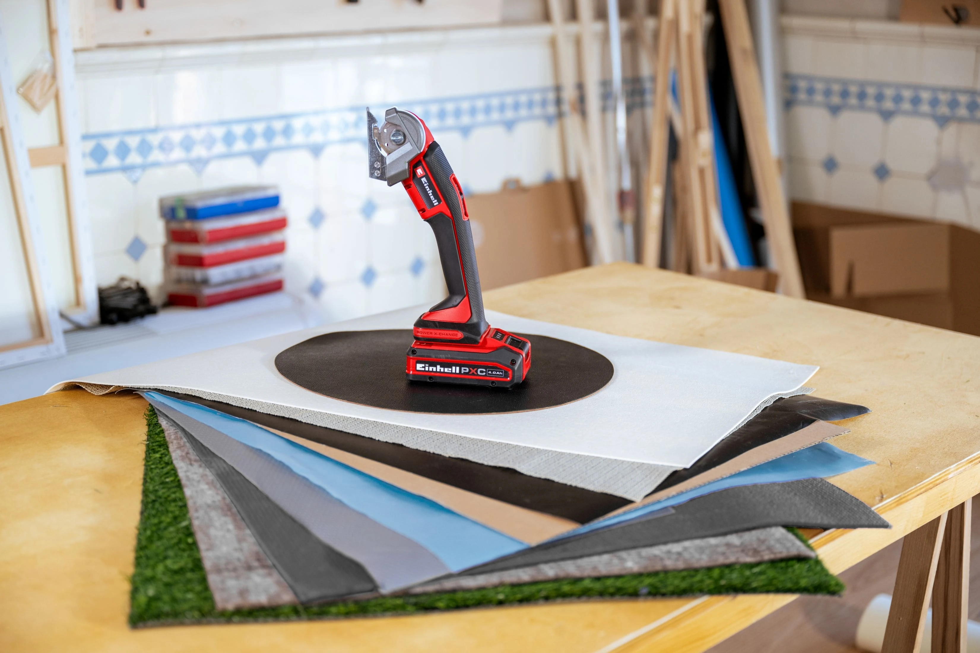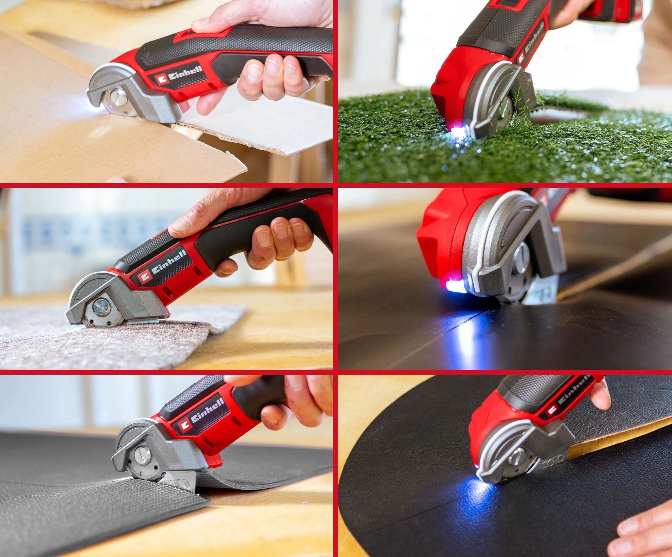 Акумуляторний універсальний різак Einhell TE-UC 18/6 Li-Solo бренду Einhell призначений для різання гнучких матеріалів під час побутових і майстерневих робіт. Інструмент працює від акумулятора системи Power X-Change напругою 18 В. Кругле самозагострювальне лезо дозволяє різати матеріали товщиною до 6 мм. Підсвічування зони різу та індикатор лінії різання допомагають контролювати процес роботи.